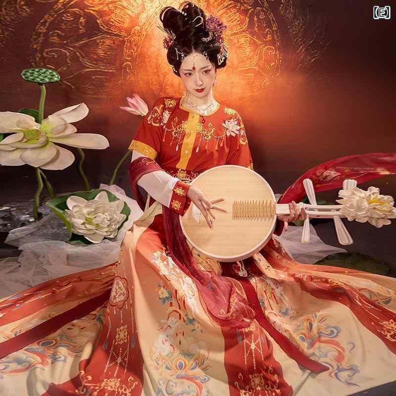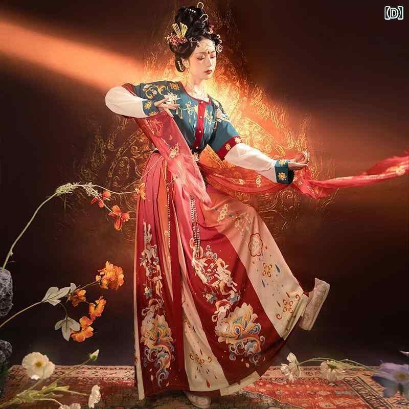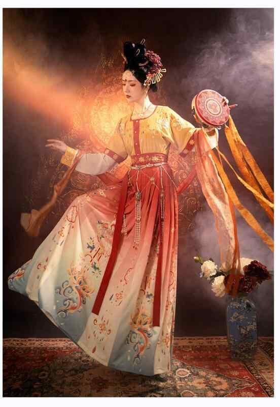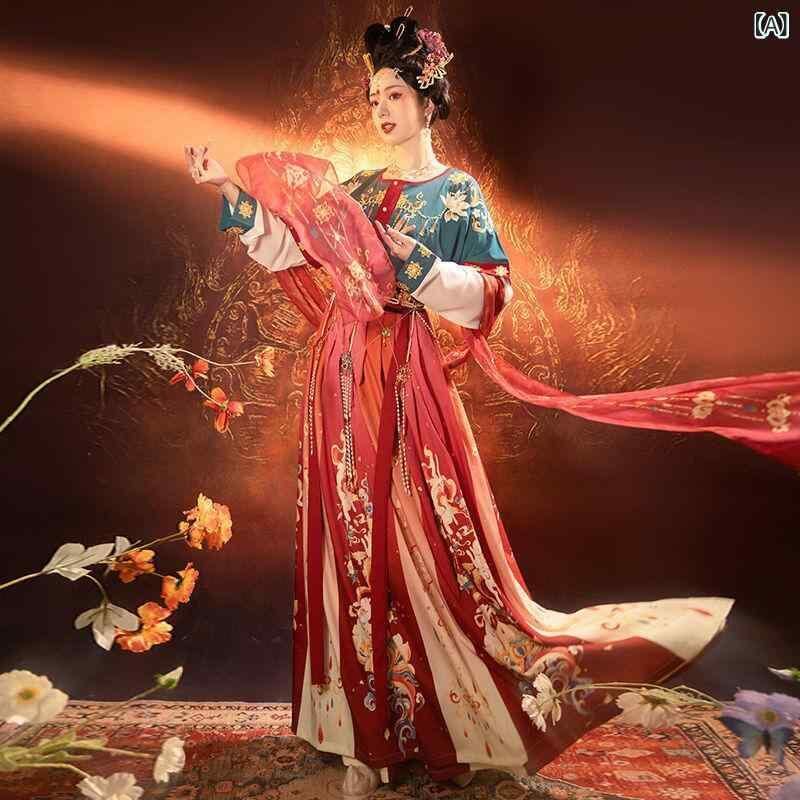 漢服 レディース カナン 唐様式 半臂 坦領 斉腰 三点セット ポリエチレン繊維 ポリウレタン 花柄 染め レースアップ グリーン オレンジ イエロー 舞台衣装 イベント 普段使い コスプレ 華やか 優雅 古典 伝統 本格的