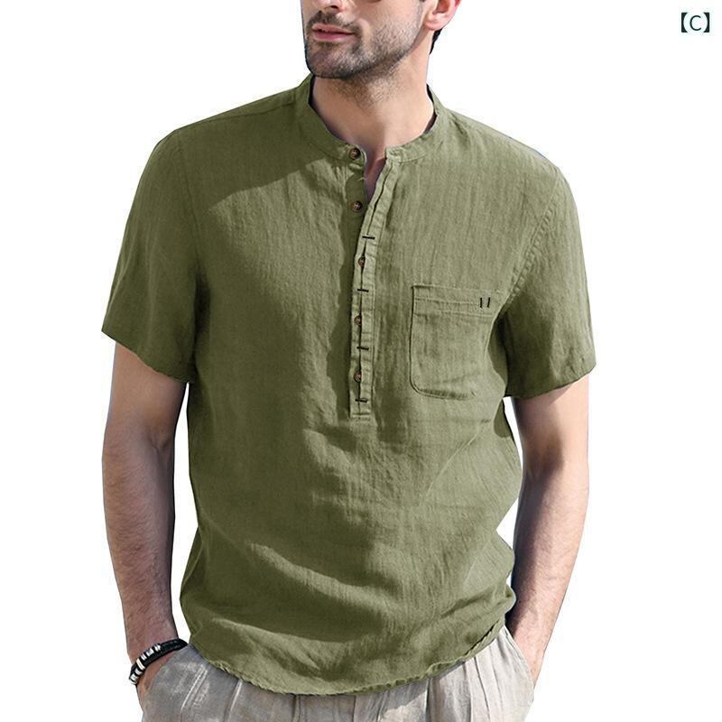 シャツ メンズ 男性用 ヘンリーネック 半袖 無地 綿麻 リネン トップス ゆったり ルーズフィット 通気性 吸湿速乾 涼しい 夏 普段使い カジュアル リゾート