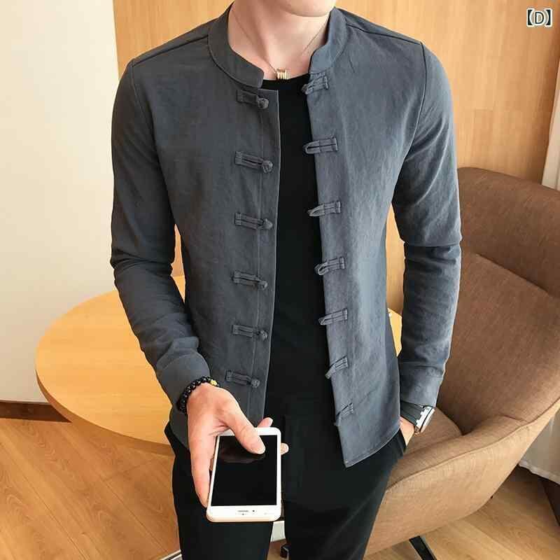 シャツ メンズ 中国風 レトロ 無地 カジュアル スリムフィット 盤ボタン 長袖 スタンドカラー 綿麻 コットンリネン トップス ホワイト ブラック レッド グレー