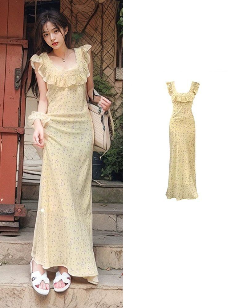 ワンピース レディース フレンチシック フェミニン 小花柄 フリル ロング丈 ウエストマーク Aライン 七分袖 Uネック 上品 エレガント デザイン性 ポリエステル レース 普段使い お出かけ イエロー ブルー 体型カバー