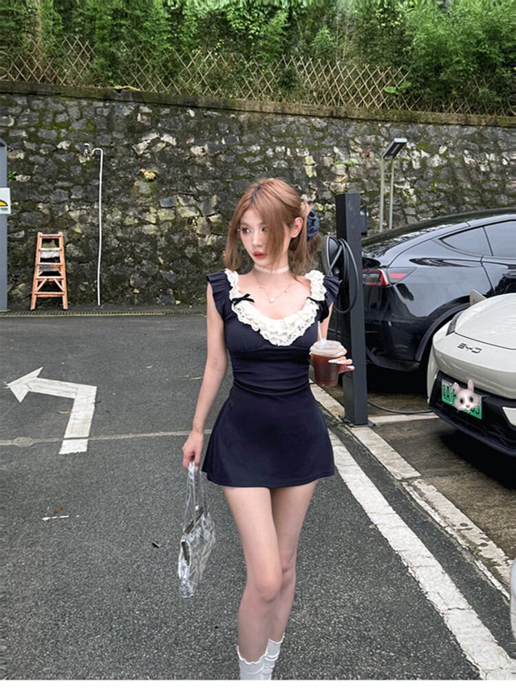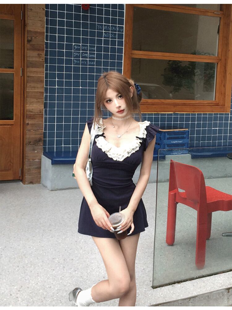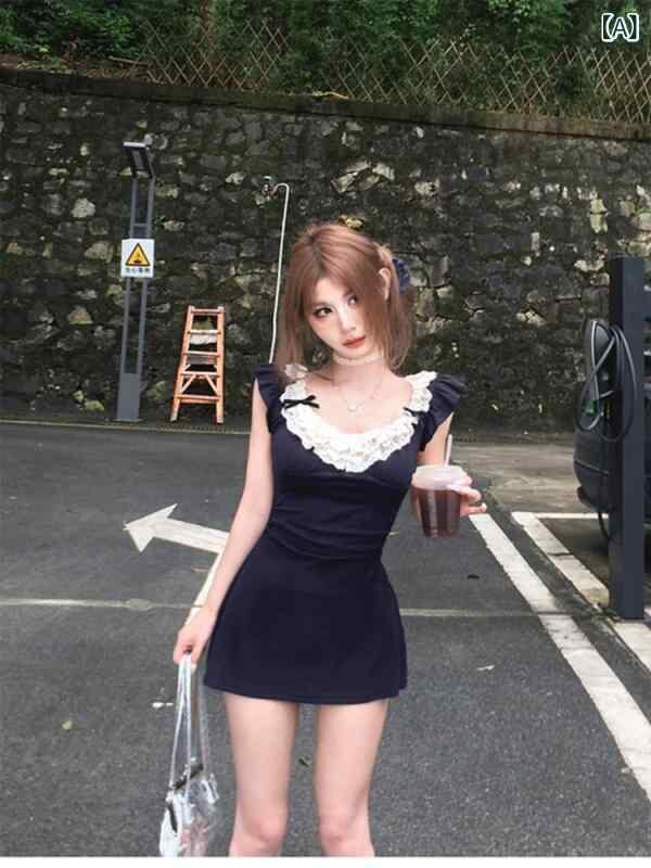 ワンピース レディース レース 切り替え カットアウト コットン 無地 スリムフィット 着痩せ スタイルアップ ハイウエスト Aライン ミニ丈 Vネック フリル袖 半袖 セクシー エレガント 高級感 夏 ネイビー