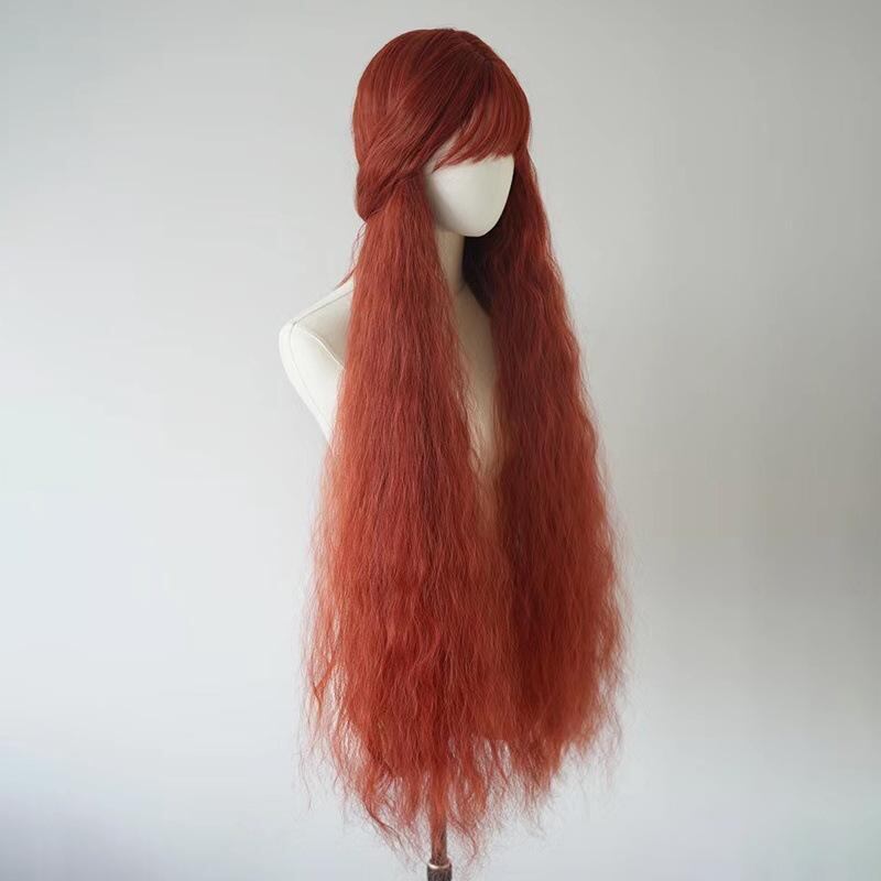 ウィッグ ぱっつん前髪 ロングカール フルウィッグ 100cm オレンジレッド 耐熱ファイバー 森ガール系 ロリータ コスプレ 小顔効果 ナチュラルスタイル