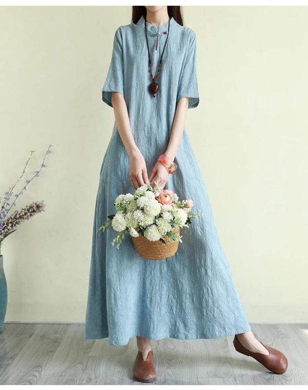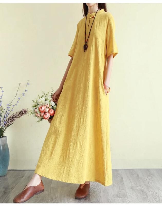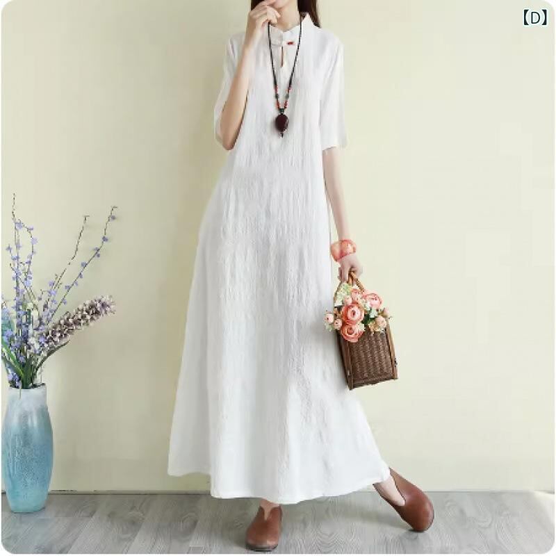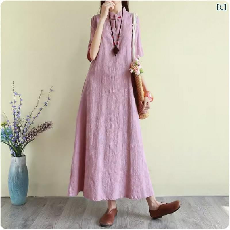 ワンピース レトロ 新チャイナスタイル ジャガード織り 半袖 フリルスリーブ ミモレ丈 Aライン ハイネック ゆったり 綿麻素材 上品 エレガント 普段使い 快適カジュアル