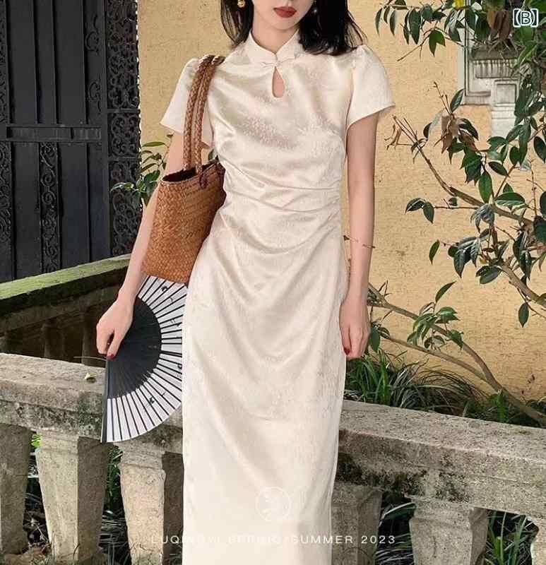 ワンピース レディース 新中華風 改良チャイナドレス 高級感 エレガント きれいめ 体型カバー Aライン ロング丈 ノーカラー ポリエステル お呼ばれ パーティー 通勤 オフィス フォーマル ブラック ライトベージュ