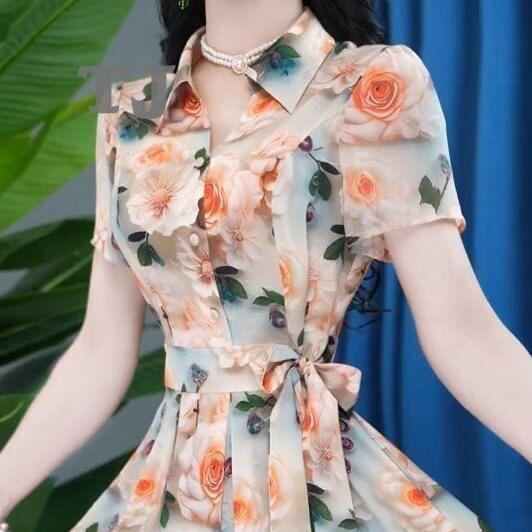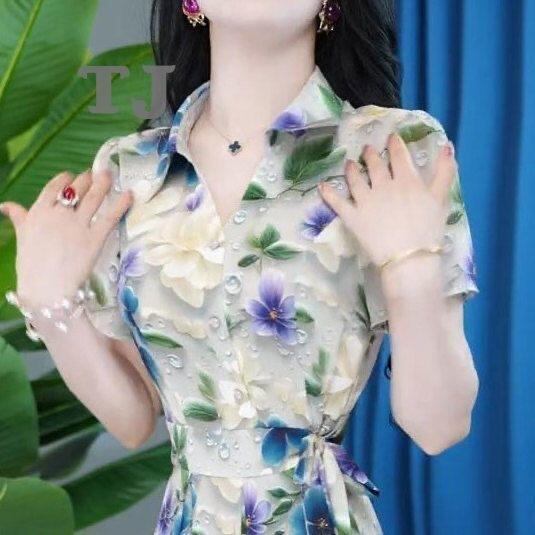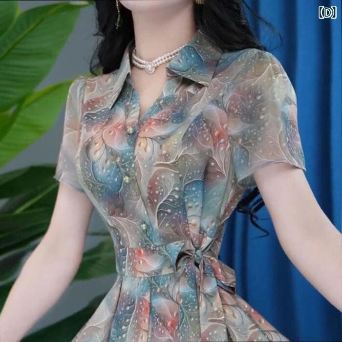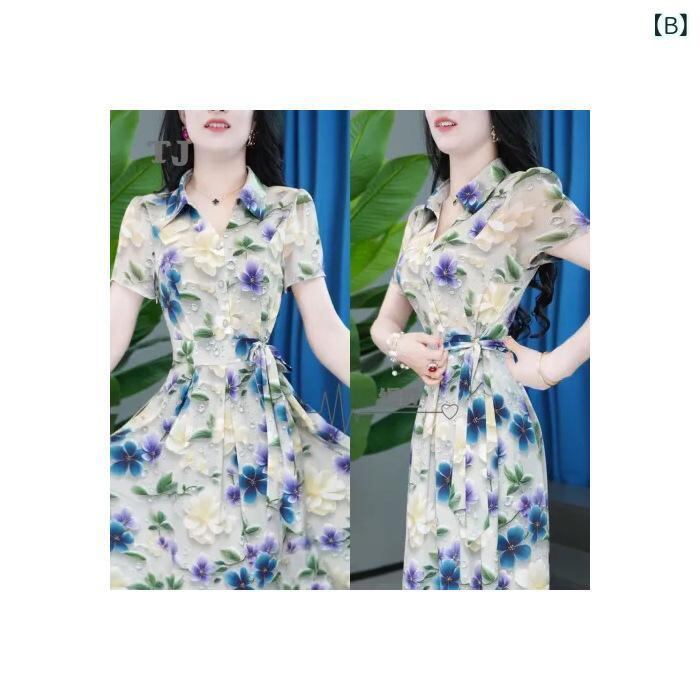 ワンピース レディース 半袖 ポリエステル 接触冷感 ウエストリボン ウエストシェイプ 細見え ミディ丈 カジュアル プリント柄 花柄 エレガント Aライン