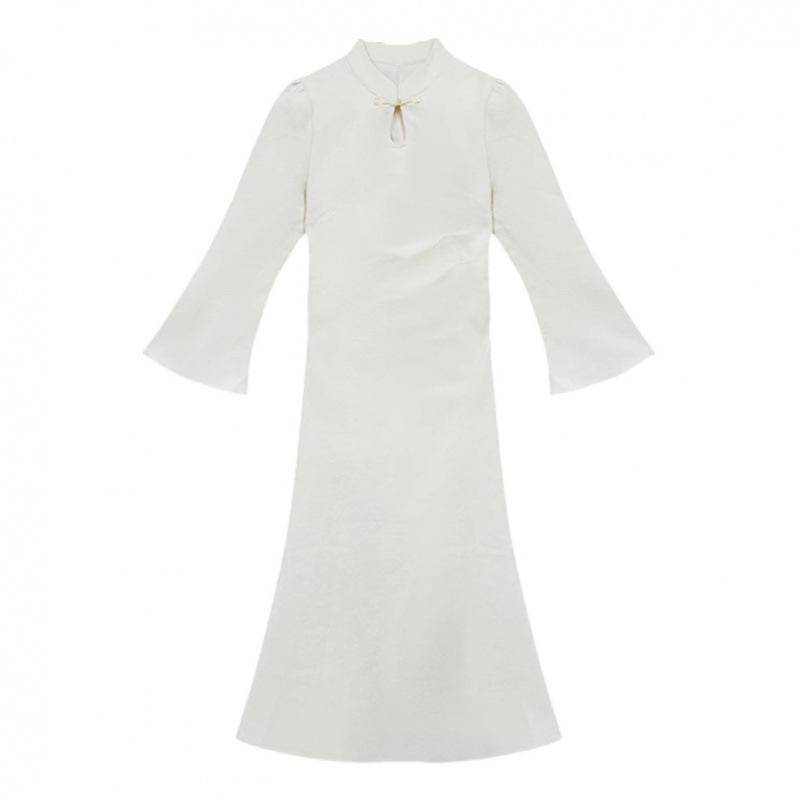 ワンピース レディース チャイナドレス風 新チャイナ風 ヘップバーンスタイル ロング丈 フォーマルドレス 大きいサイズ ウエストマーク 細見え スタンドカラー 長袖 ベルスリーブ ポリエステル 無地 クラシカル