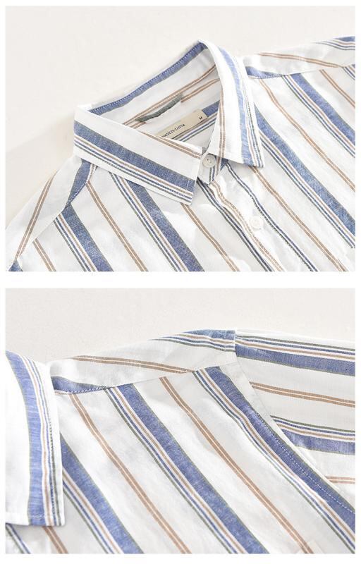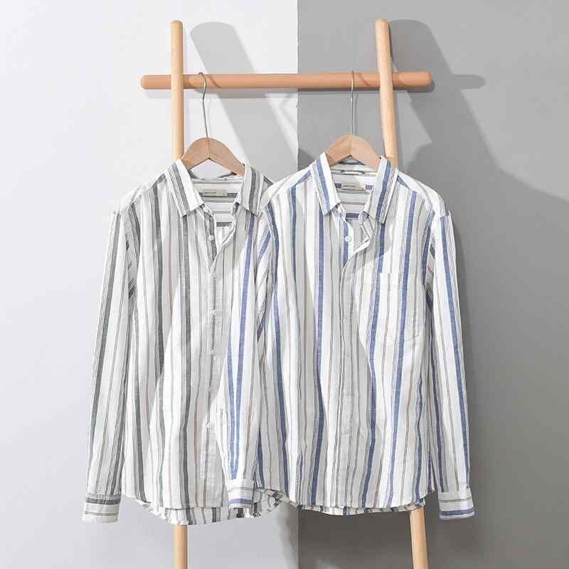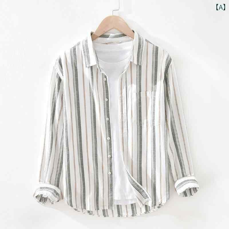 シャツ メンズ 男性用 長袖 日系 カジュアル ストライプ 綿麻 リネン混 レギュラーカラー ゆったり ルーズフィット 薄手 軽量 イージーケア トップス 夏服 羽織り 普段使い デイリー リラックスウェア