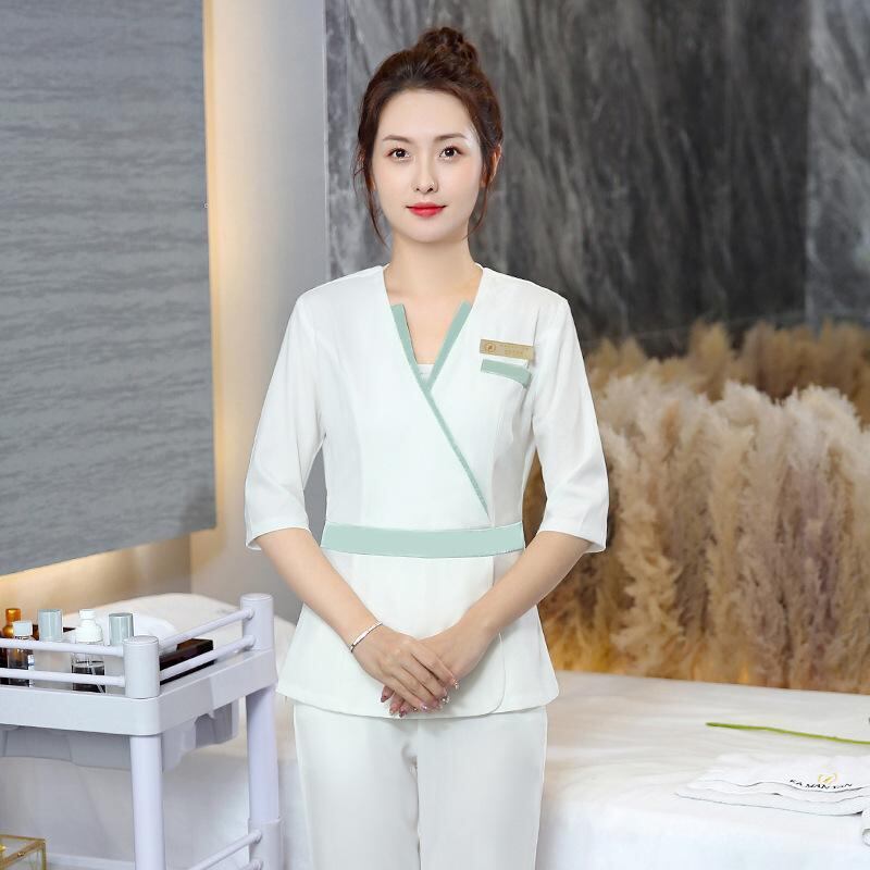 ウェア レディース エステユニフォーム 美容院 スパ マッサージ 施術用 作業着 吸湿速乾 ドルマンスリーブ 五分袖 スリム シェニール織り ポリエステル 上下セット 五分丈パンツ 白 ピンク 紫