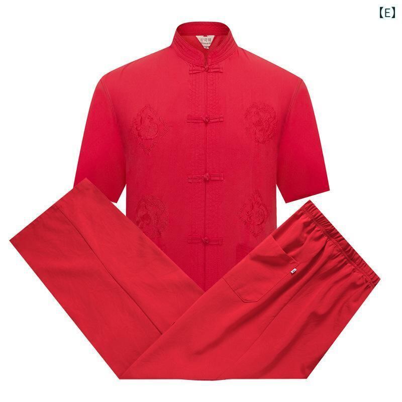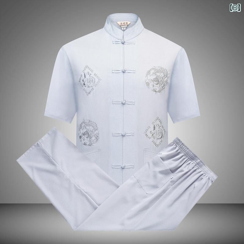 太極拳ウェア メンズ ミドル世代 シニア 半袖 セットアップ スタンドカラーシャツ チャイナ風 龍柄刺繍 夏用 カジュアル リラックスウェア ポリエステル混紡