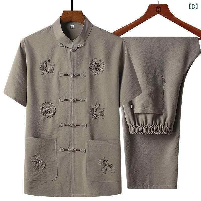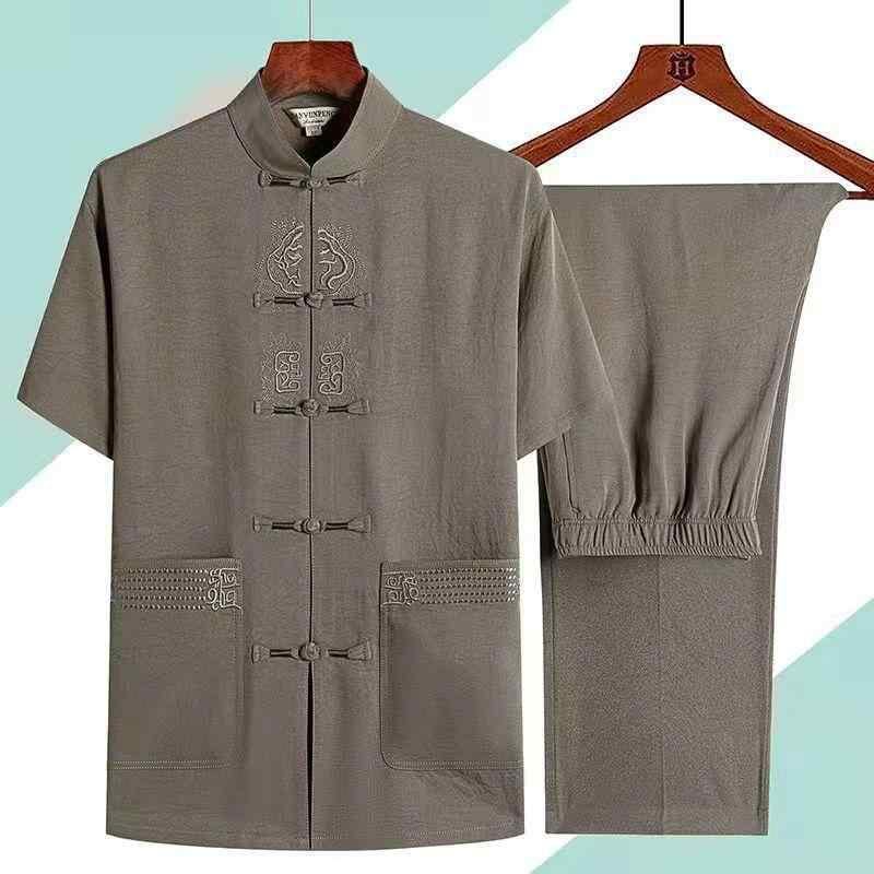 唐装 作務衣風 男性用 シニア 半袖 夏物 上下セット 中国風 カジュアルスタイル 普段使い 部屋着 リラックスウェア 太極拳ウェア ポリエステル混紡 ポケット付き