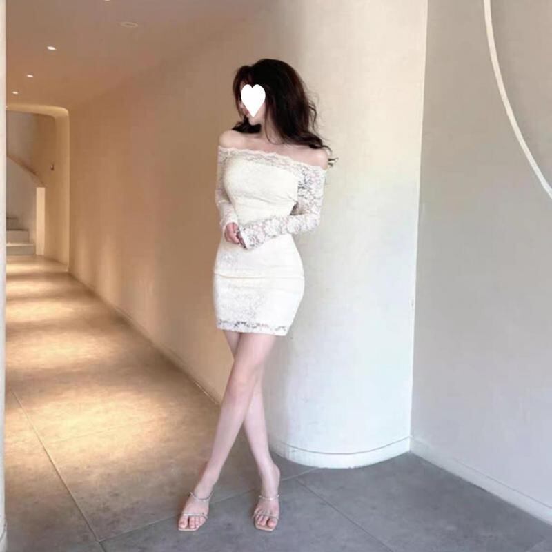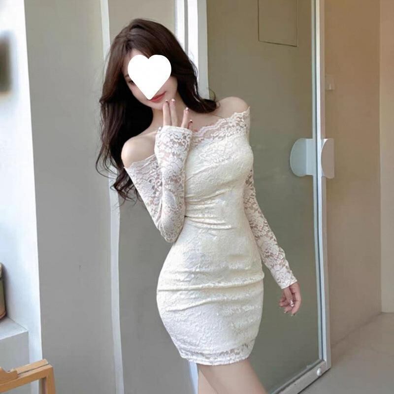 ワンピース レディース 大きいサイズ オフショルダー タイト レース ロング丈 長袖 ドレープネック フリル袖 シアー感 フェミニン エレガント 上品 ストリート 体型カバー 着痩せ