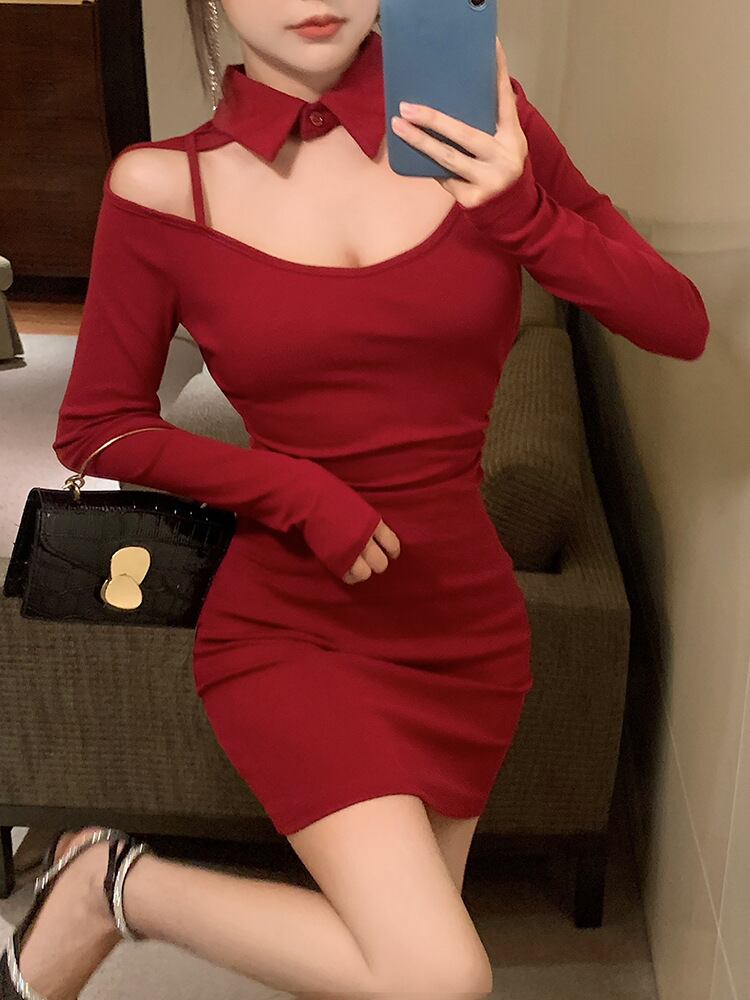 ・カテゴリ: ワンピース・素材: ポリエステル95%以上・柄: 無地・デザイン: カットアウト・シルエット: タイトスカート・セット内容: 単品・スカート丈: ミニ丈・ネックライン: ホルターネック・袖タイプ: レギュラー・袖丈: 長袖・ウエスト: ミドルウエスト・スタイル: お嬢様系・開閉タイプ: プルオーバー・テイスト: 甘辛ミックス・カラー展開: ブラック、レッド・サイズ展開: S、M、L、XL