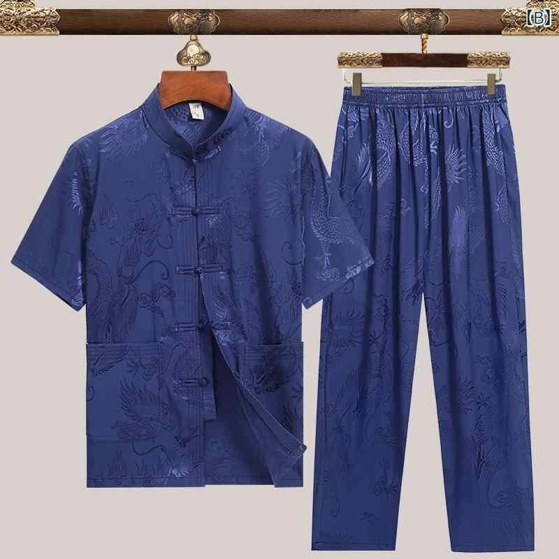 セットアップ メンズ シニア 中高年 半袖 シャツ 民族風 チャイナ服 綿麻 夏物 カジュアル 普段使い リラックスウェア 通気性 快適 シルバーグレー ロイヤルブルー ダークブラウン