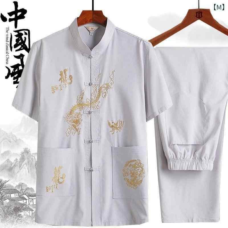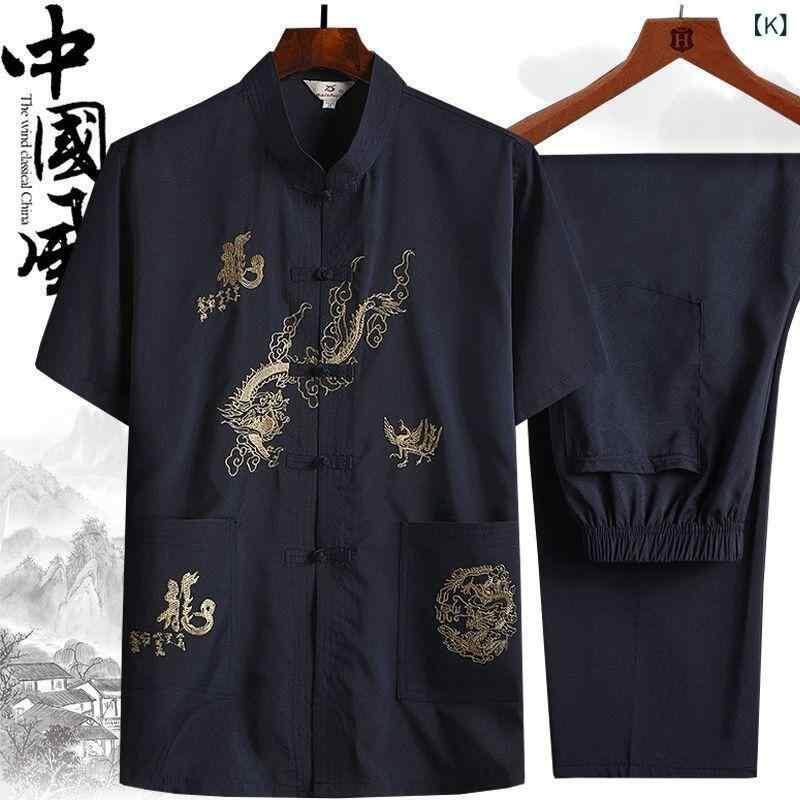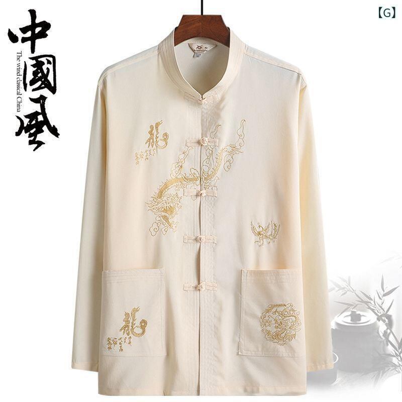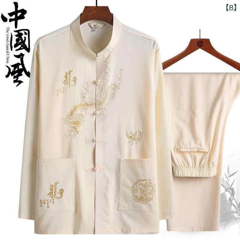 唐装 セット メンズ 男性用 シニア 中高年 お父さん おじいちゃん 長袖 シャツ 上下セット 龍 刺繡 ポリエステル混紡 軽量 ゆったり 大きいサイズ オールシーズン 部屋着 普段着 カジュアル リラックスウェア