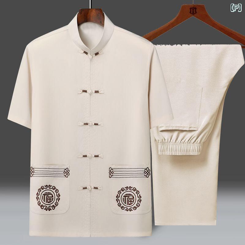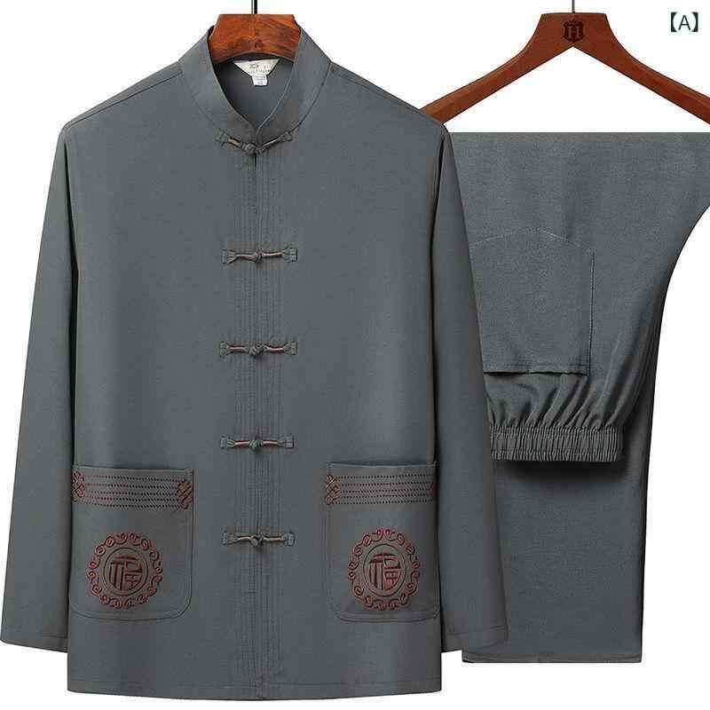 中華服 セットアップ メンズ 中高年 父親 祖父 シニア 男性用 長袖 中国風 伝統的 盤扣 ポリエステル混紡 しわになりにくい カジュアル オールシーズン ダークグレー ネイビー