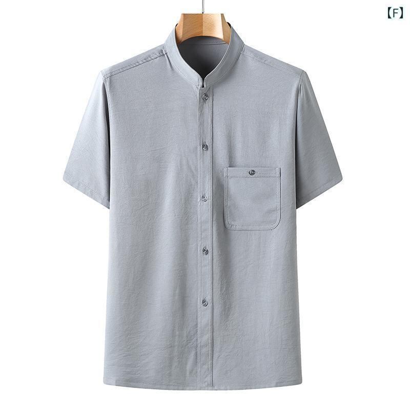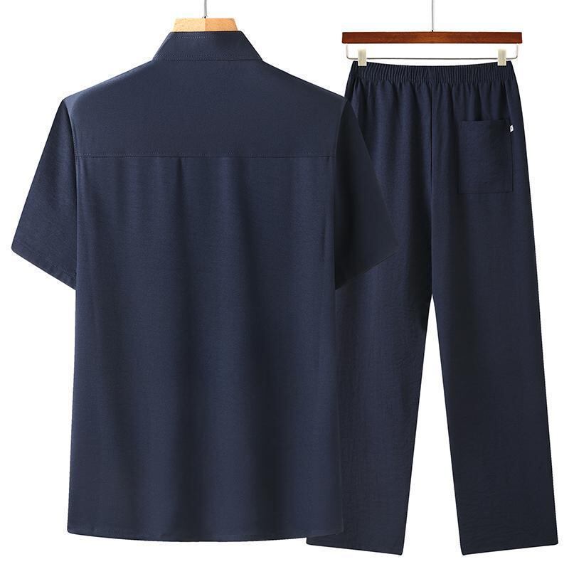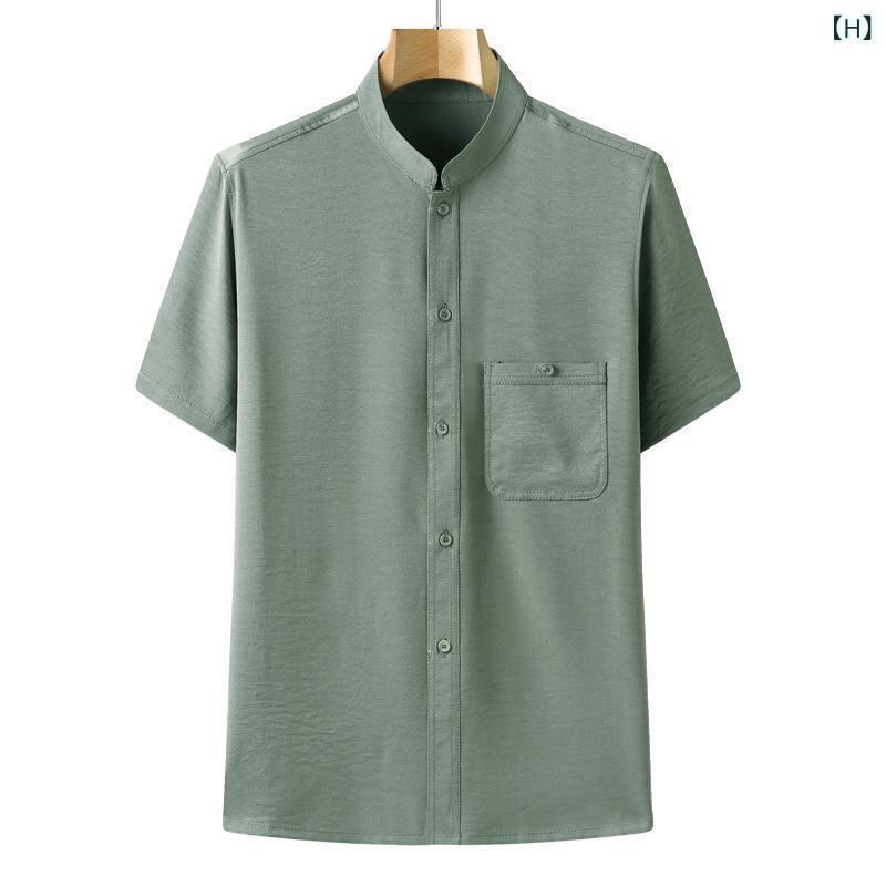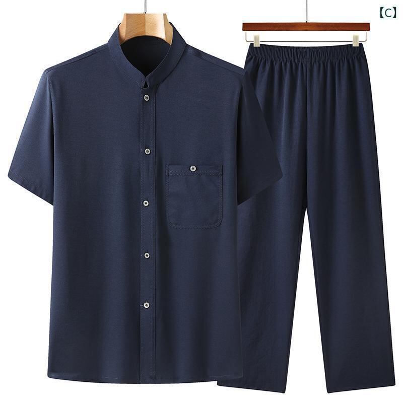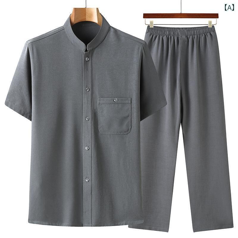 シャツ メンズ シニア 男性用 中高年 唐装 セットアップ 半袖 薄手 接触冷感 刺繍入り ポリエステル混紡 カジュアルウェア 普段着