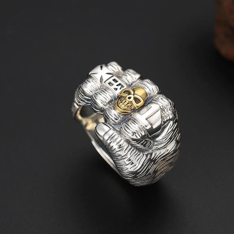リング 男女兼用 ユニセックス 拳モチーフ スカル ドクロ スマイル デザイン 個性的 ワイルド クール ヒップホップ ストリート系 フリーサイズ オープンリング 人差し指 インデックスリング 亜鉛合金 メッキ ファッション おしゃれ カジュアル アンテ