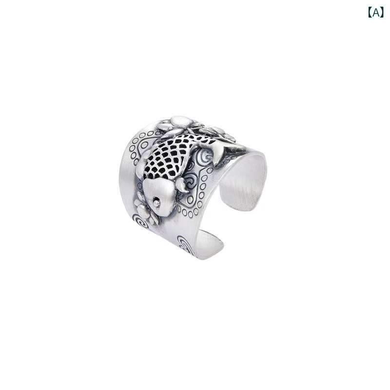 リング レディース 鯉 蓮モチーフ レトロ 森ガールテイスト アンティークシルバー調 燻し加工 合金製 フリーサイズ オープンリング サイズ調整可能 シンプル おしゃれ 個性的 カジュアルスタイル デイリーユース 指輪