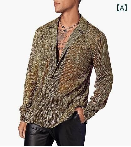 シャツ メンズ トップス シアー 光沢 キラキラ 長袖 襟付き ゆったり ルーズシルエット 薄手 通気性 ポリエステル混紡 カジュアルスタイル ゴールド シルバー