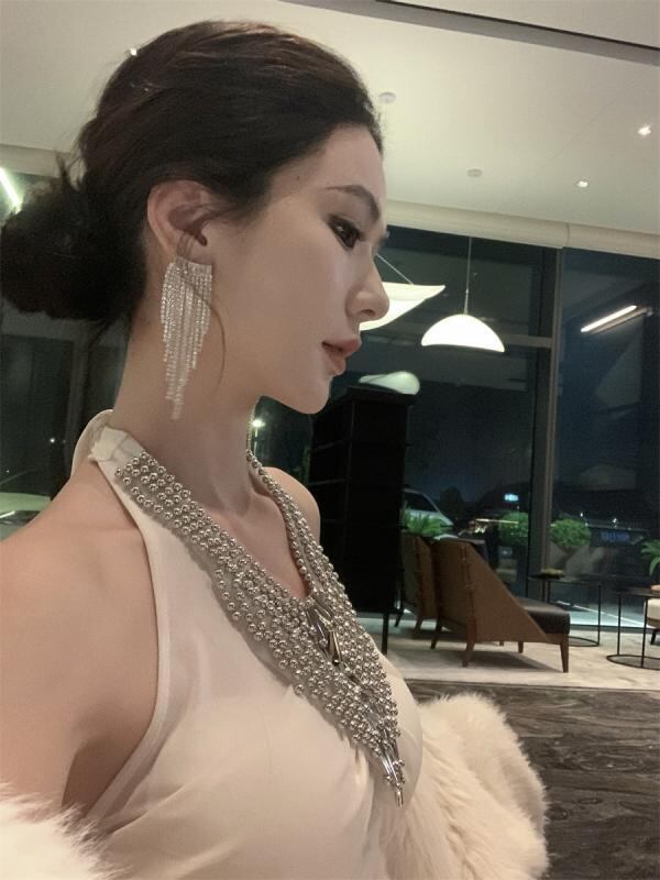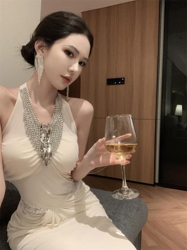 ワンピース レディース ホルターネック ノースリーブ レース切り替え ビーズ装飾 マーメイドライン ロング丈 ウエストマーク ハイウエスト タイトシルエット 上品 エレガント ポリエステル スパンデックス ベージュ系カラー