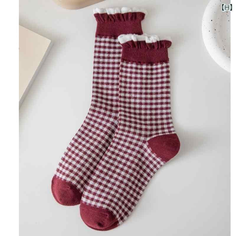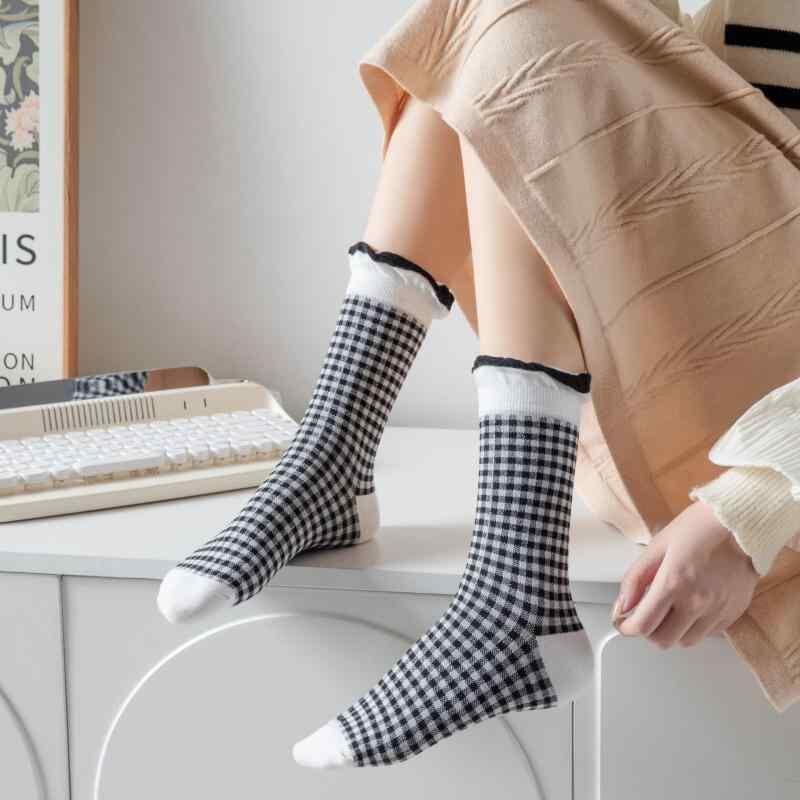 ソックス レディース ロリータ フリル ミドル丈 クルー丈 くしゅくしゅ ルーズソックス チェック柄 格子柄 水玉 ドット柄 スクール風 綿素材 コットン 吸湿速乾 普段使い オールシーズン