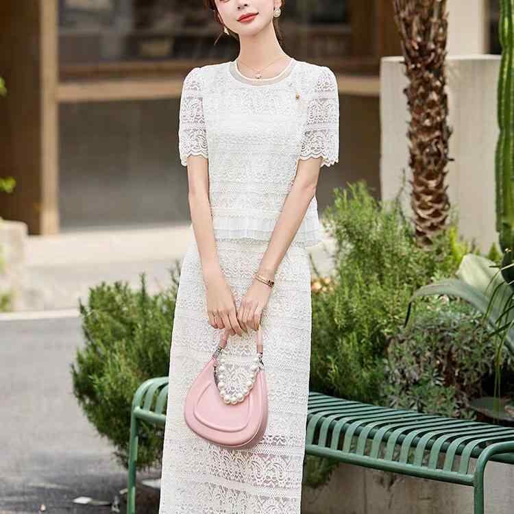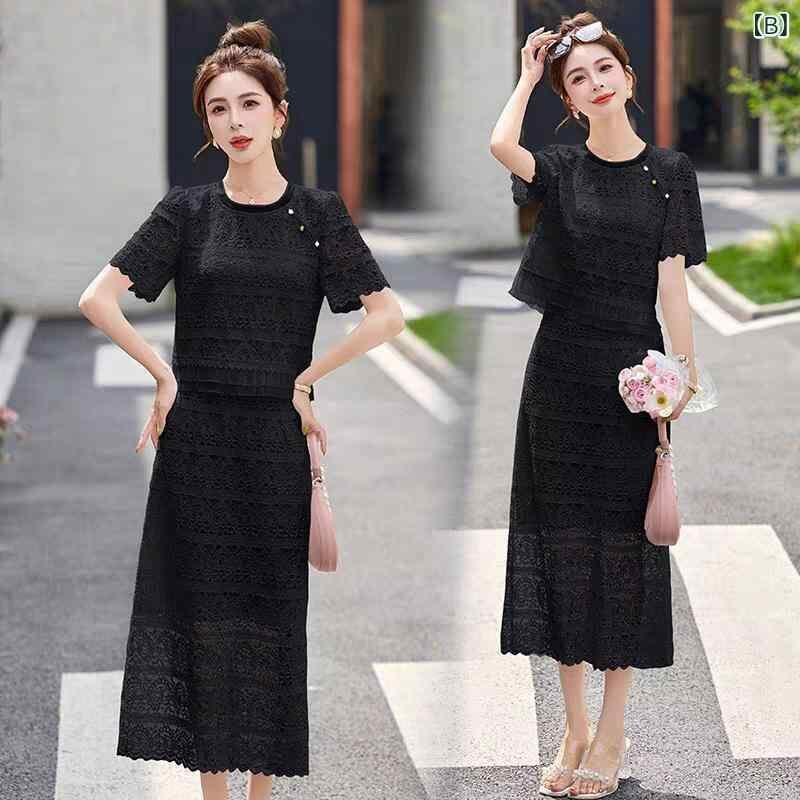 セットアップ レディース レース 透かし編み トップス スカート 綿 コットン ポリエステル 上品 エレガント きれいめ 夏 サマー カジュアル ベージュ ブラック ツーピース