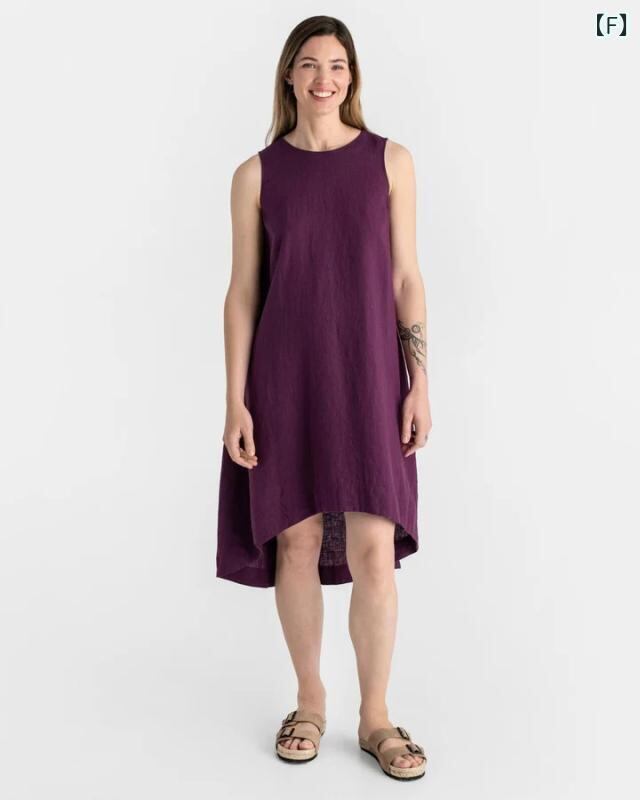 ワンピース 綿麻 無地 ラウンドネック ノースリーブ アシンメトリー 変形 ロング丈 マキシ丈 ミドルウエスト レトロ ヴィンテージ カジュアル リラックス 快適 ゆったり 体型カバー 普段使い お出かけ リゾート
