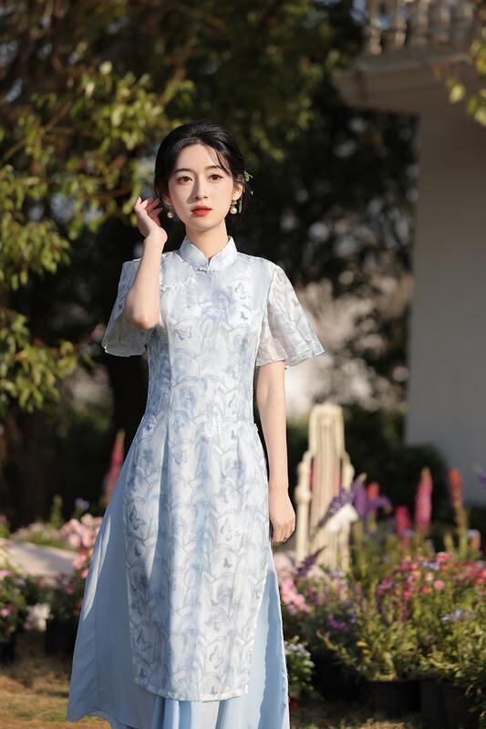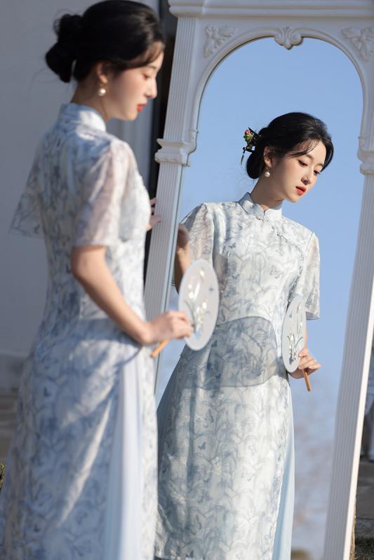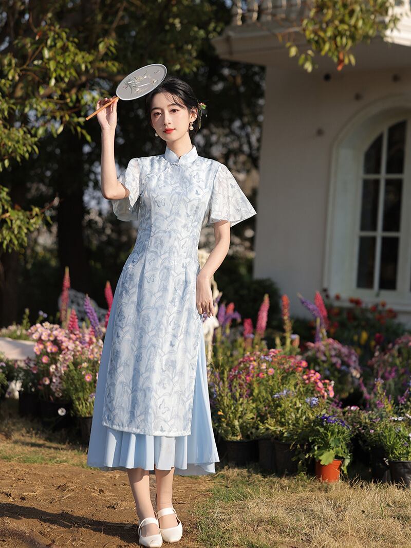 ワンピース レディース 小花柄 チャイナドレス 中国風 民国風 レトロ 上品 高級感 改良 エレガント スリム ロング丈 スタンドカラー フリル袖 ポリエステル 微ストレッチ