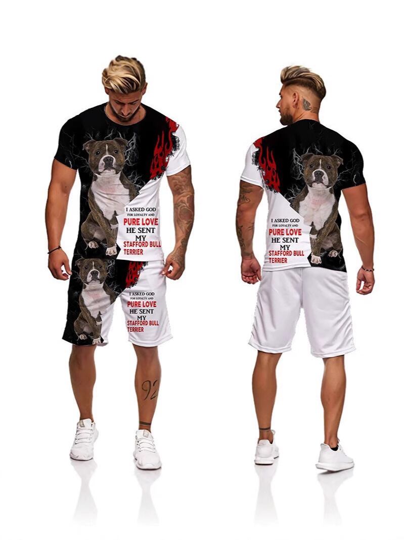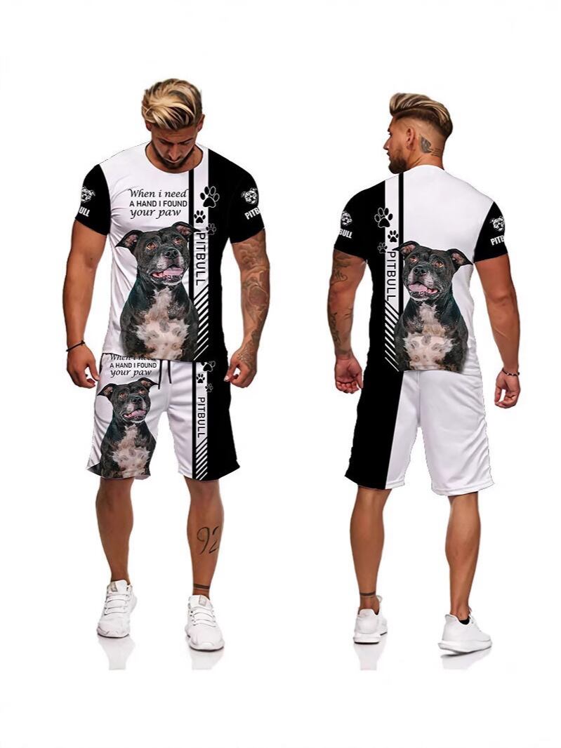 Tシャツ ショートパンツ セットアップ メンズ スポーツウェア 3D 犬柄プリント クルーネック 半袖 タイトフィット トレーニングウェア ポリエステル バーズアイ生地 夏用