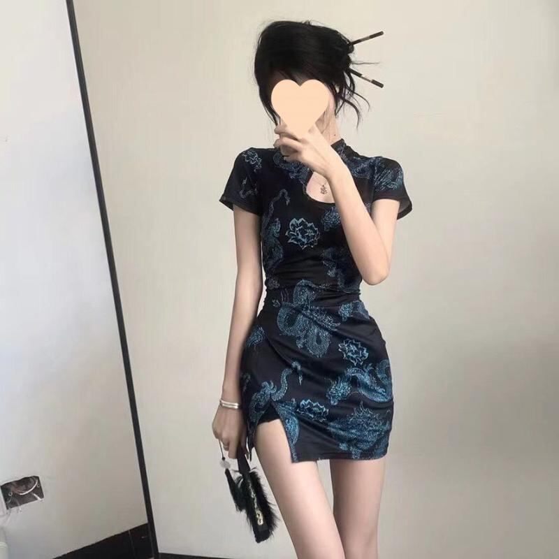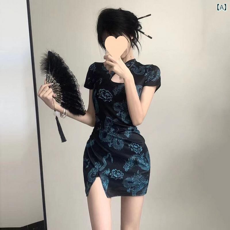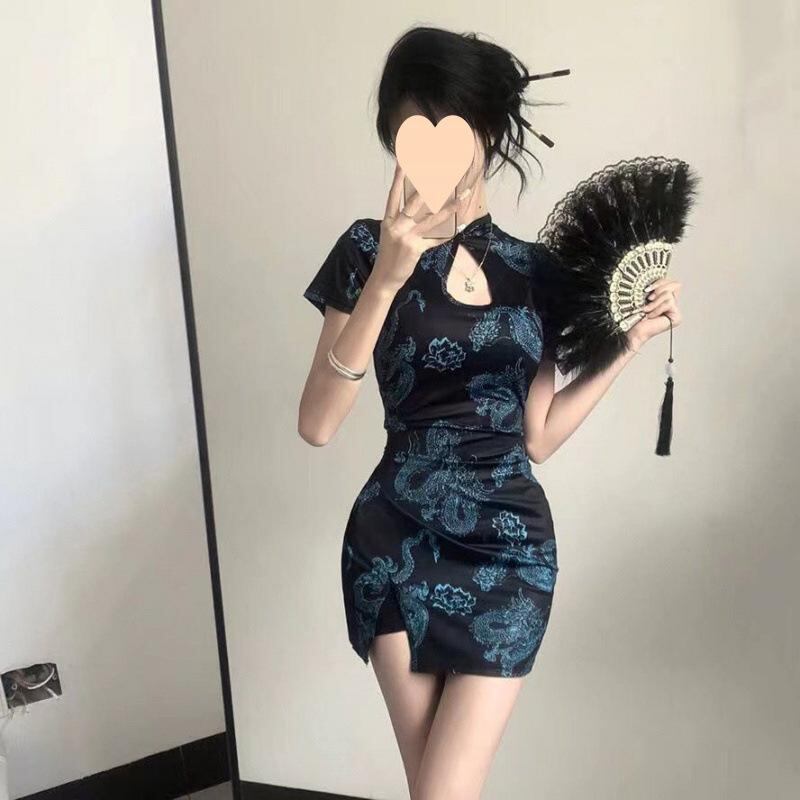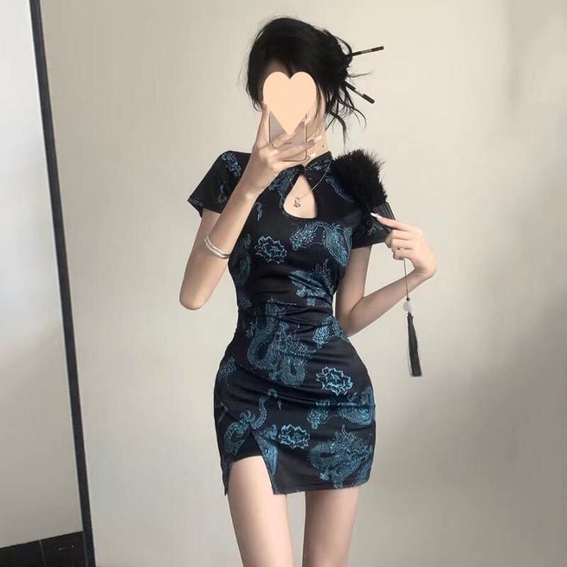 チャイナワンピース レディース 改良チャイナドレス 新中国風 モダン 大人セクシー サイドスリット カットアウト 透け感 半袖 ミニ丈 スタンドカラー チャイナボタン プリント タイトシルエット ポリエステル 夏物