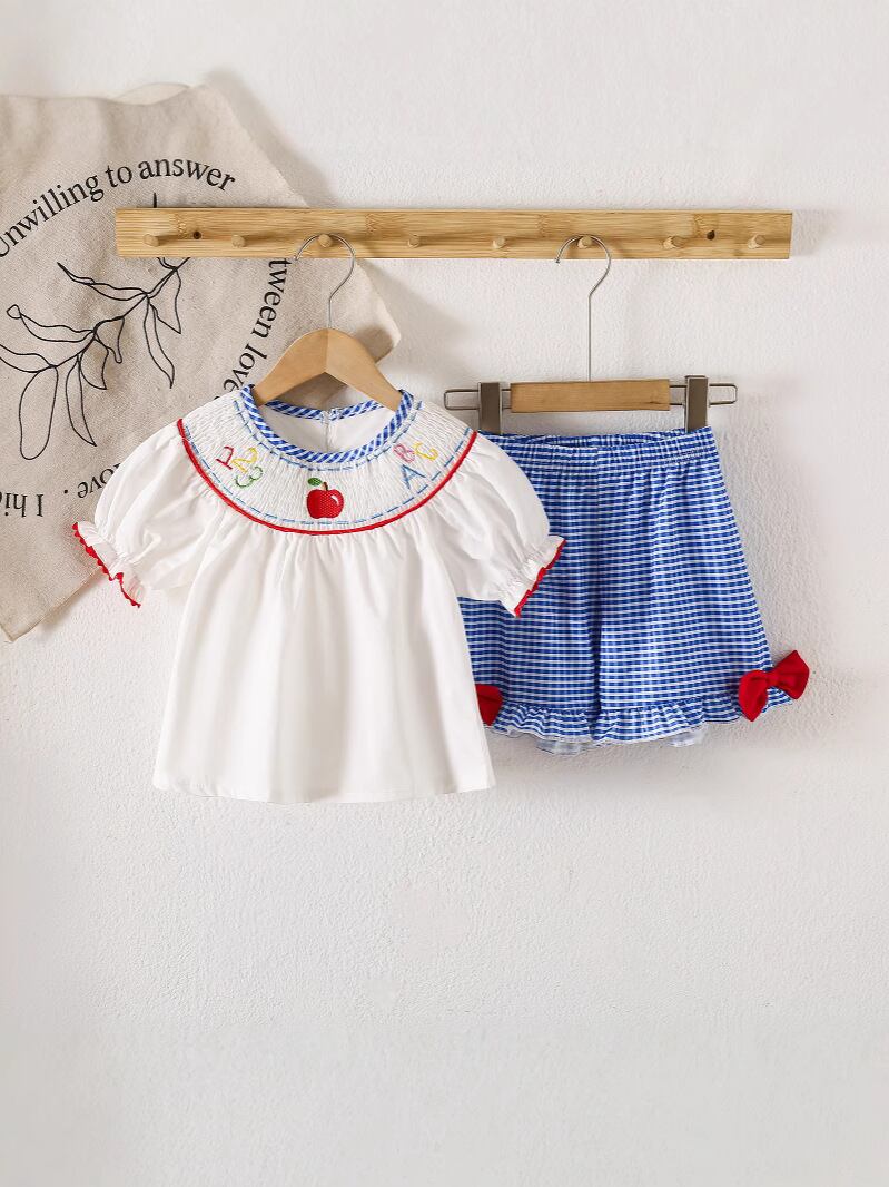 子供服 女の子 夏 カジュアル 半袖 セットアップ ドールカラー ギャザー刺繍 チェック柄 ショートパンツ 上下セット 2点セット 綿 コットン ポリエステル ホワイト