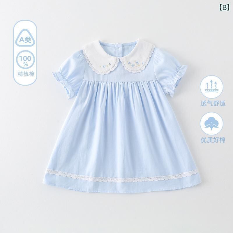 ・カテゴリ: ワンピース・スタイル: プリンセス・主な素材: 綿100%・裏地素材: 綿100%・性別: 女の子・対象年齢: 1〜3歳・柄: 無地・加工: 柔らか加工・季節: 夏・袖丈: 半袖・裾のスタイル: プリンセス・カラー展開: ホワイト、ブルー・サイズ展開: 80cm、90cm、100cm、110cm、120cm