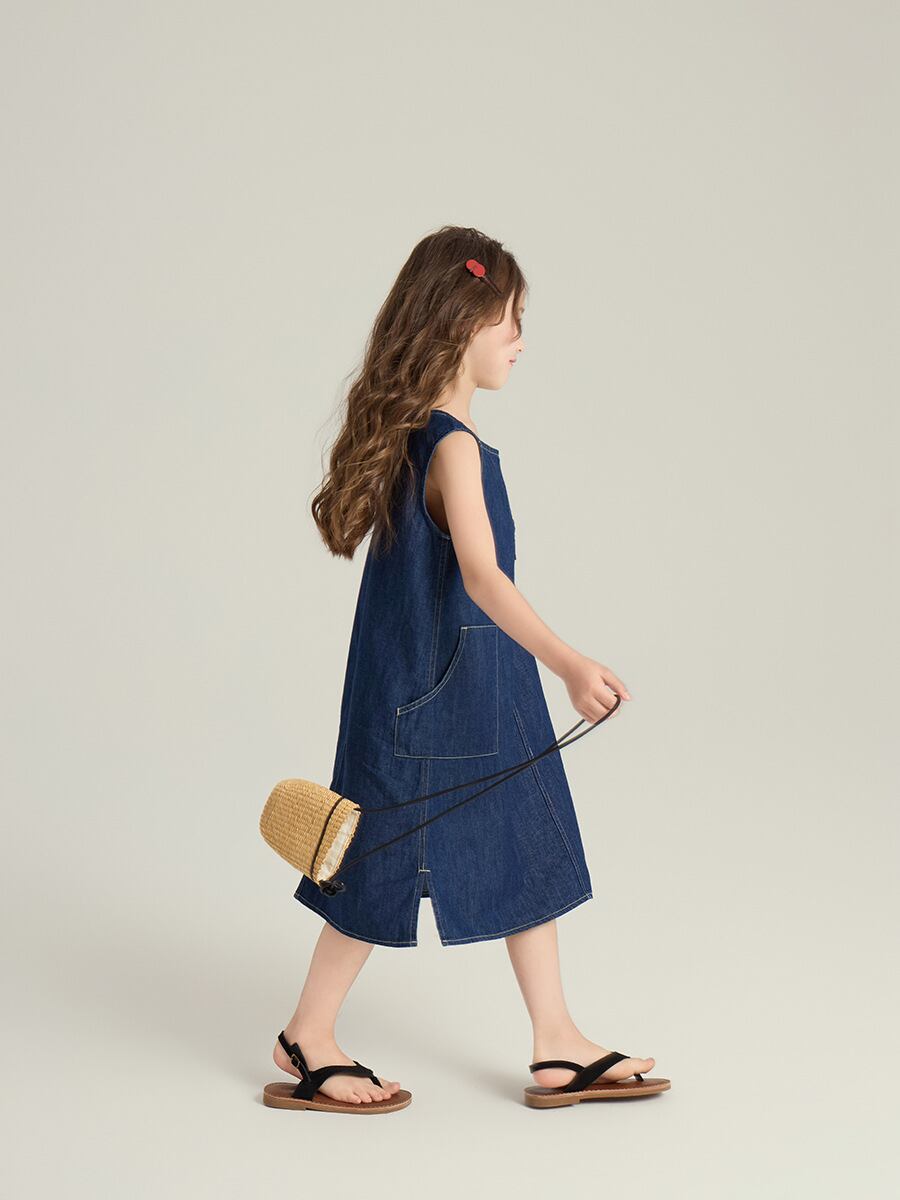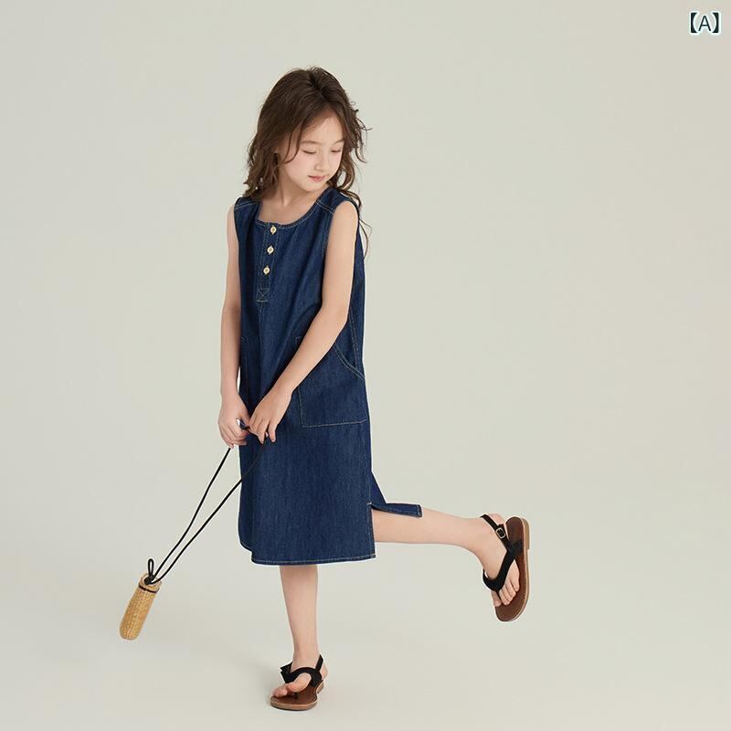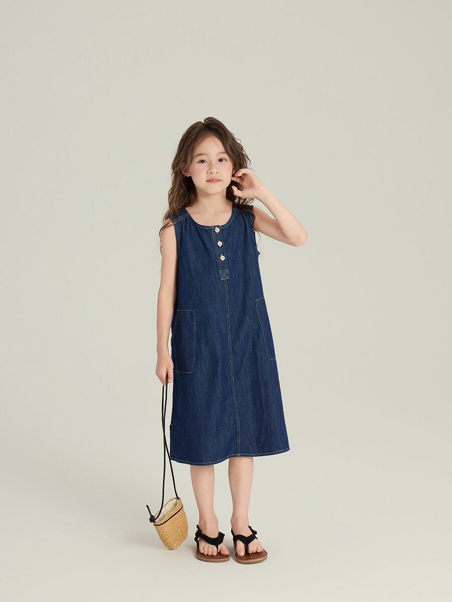 ワンピース 女の子 キッズ 子供服 夏服 韓国風 香港風 おしゃれ かわいい デニム ジャンパースカート キャミソールワンピース Aライン 綿素材 リヨセル混 ソフトタッチ 無地 ブルー 小学生