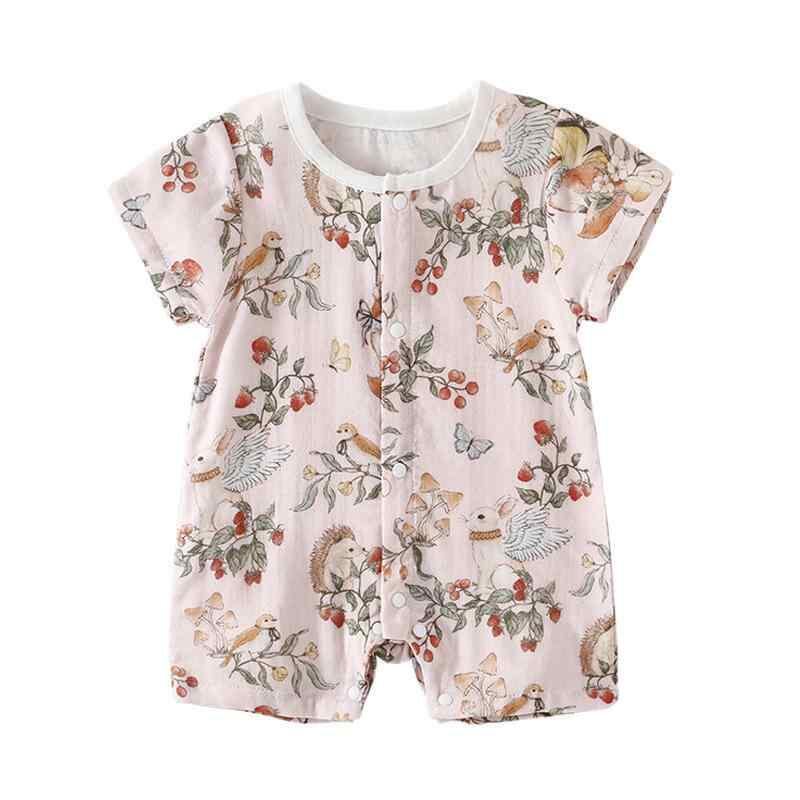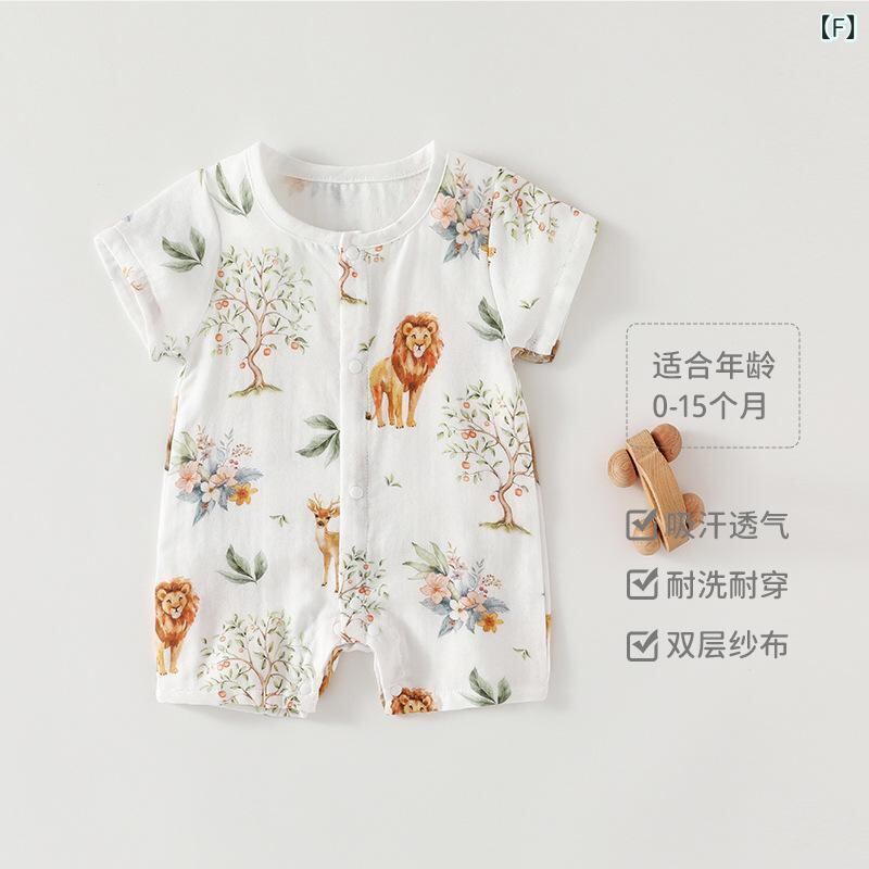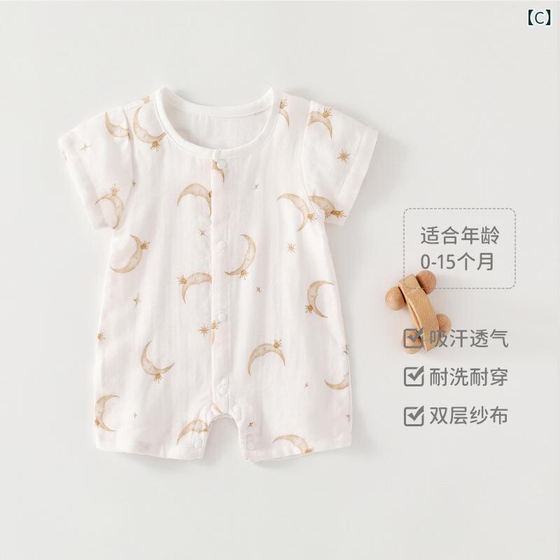 ロンパース ベビー 新生児 男女兼用 半袖 夏用 薄手 ガーゼ 綿 再生繊維 通気性 快適 カバーオール カジュアル プリント柄