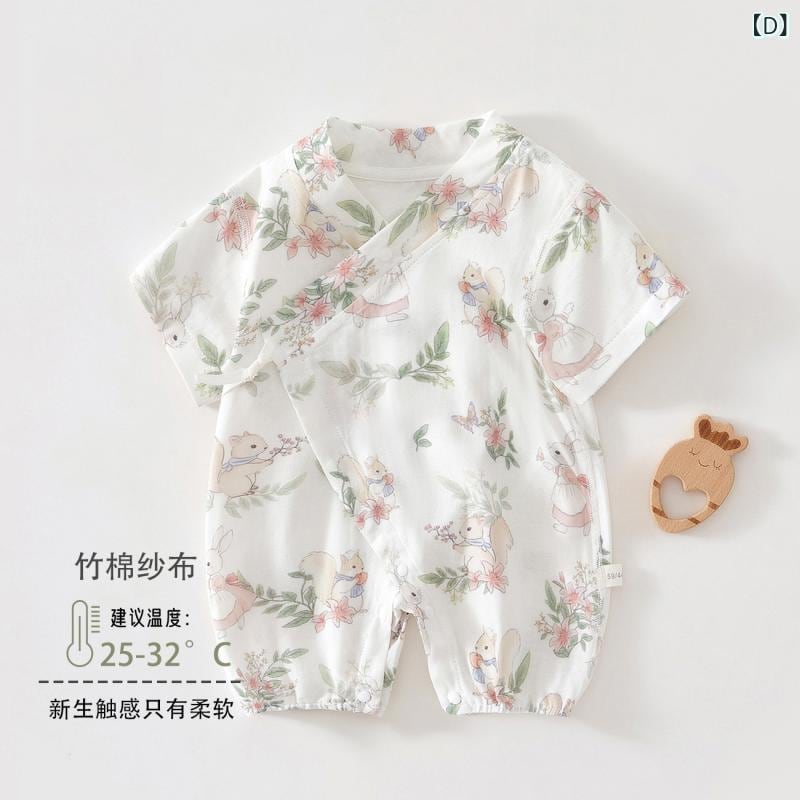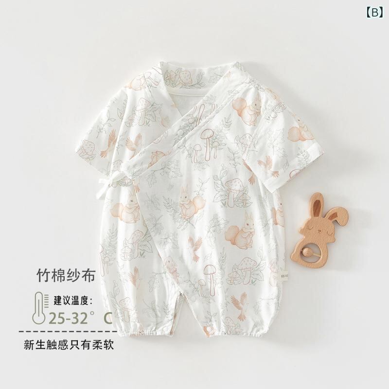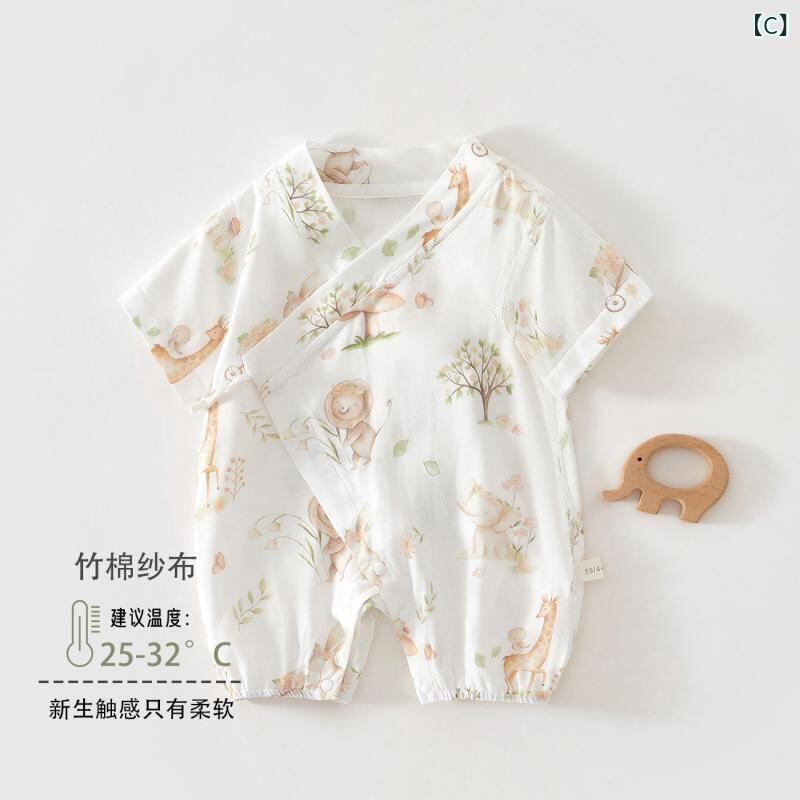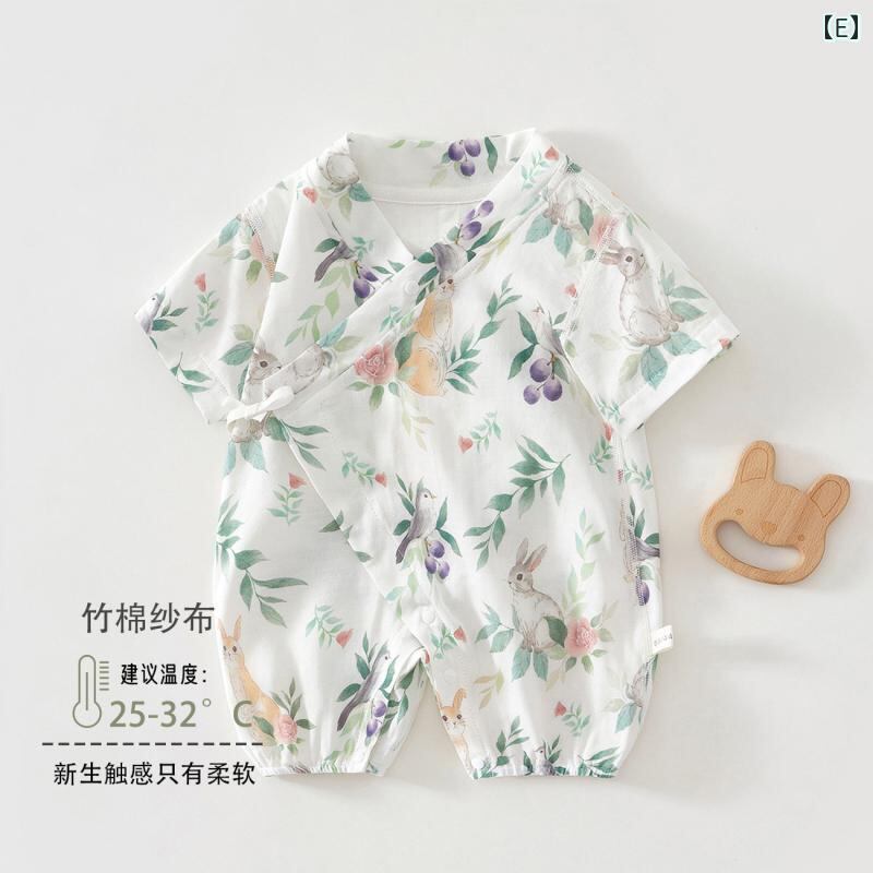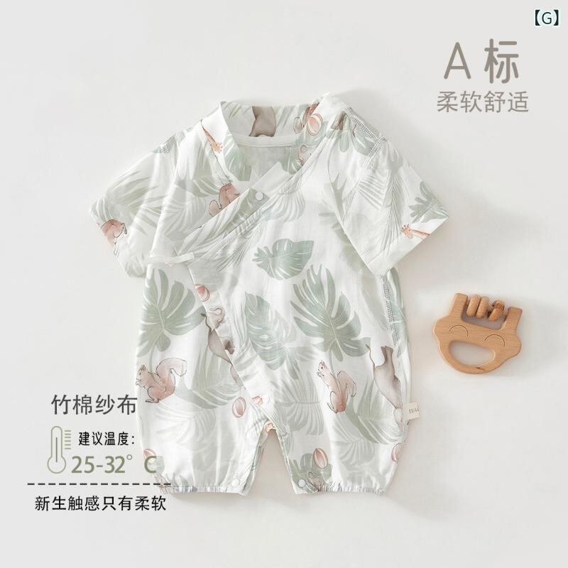 ロンパース ベビー 男女兼用 新生児 半袖 カバーオール 甚平 竹繊維 ガーゼ 薄手 無縫製 斜め襟 紐結び 赤ちゃん 夏服 パジャマ ルームウェア
