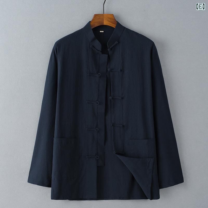 シャツ メンズ 男性用 中国風 唐装風 漢服風 長袖 羽織り レトロ ヴィンテージ スタンドカラー 立ち襟 チャイナボタン 結びボタン ラグラン袖 ポリエステル綿混紡 カジュアル 普段着 リラックスウェア 薄手 通気性