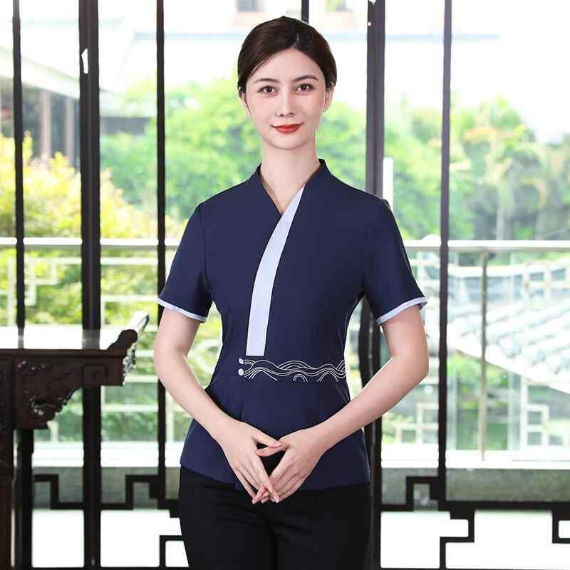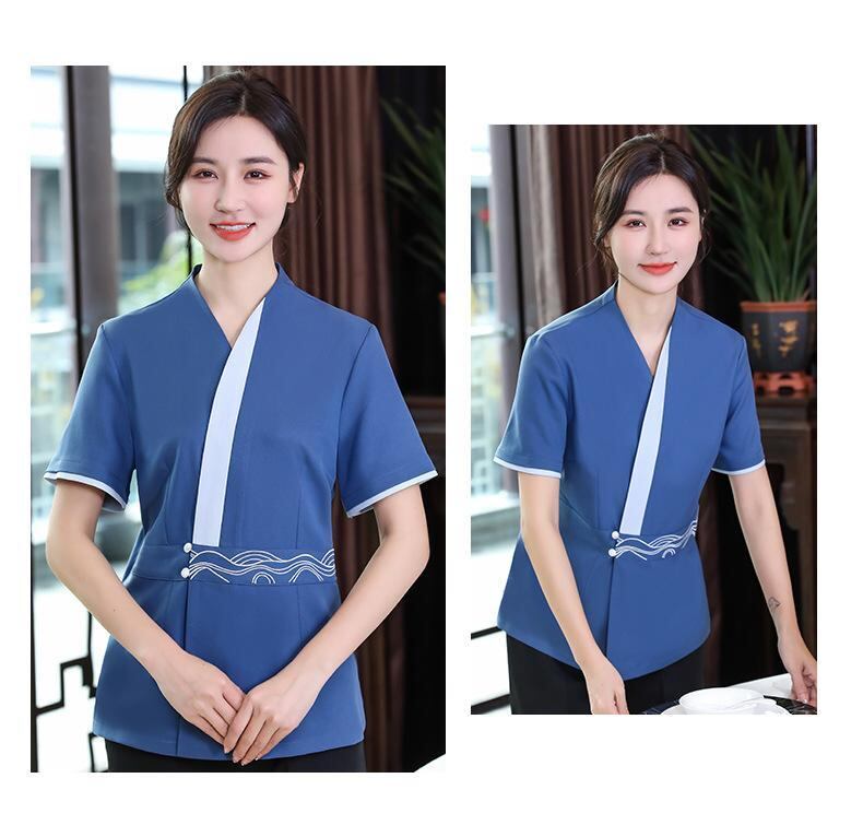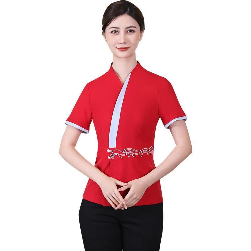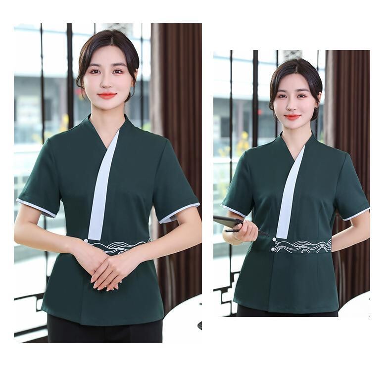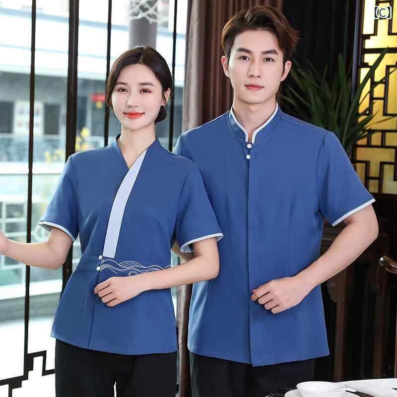 ユニフォーム 男女兼用 半袖 飲食店 ホテル レストラン カフェ 美容院 エステ サロン スタッフ 作業服 制服 上着 中華風 斜め前立て ウエストマーク 綿混 ポリエステル 吸湿速乾 夏物 グリーン ブルー レッド ネイビー