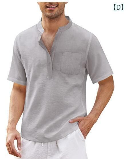 シャツ メンズ 半袖 スタンドカラー プルオーバー ポケット付き ゆったり ヒッピー カジュアル 無地 サマー デイリー 普段使い 化繊混紡 ポリエステル