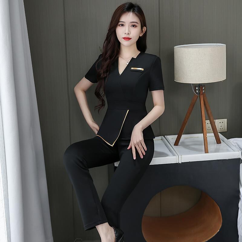 エステユニフォーム レディース 美容サロン リラクゼーション スパ 温浴施設 足つぼ 技師 セラピスト スタッフ 業務服 半袖 パンツスタイル セットアップ 吸湿速乾 綿混 ポリエステル ブラック ネイビー