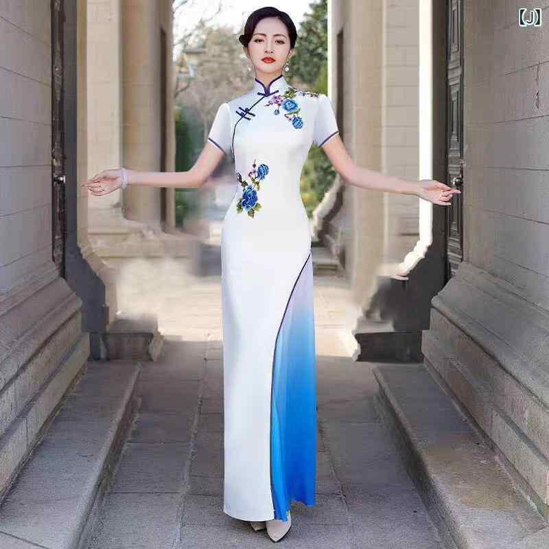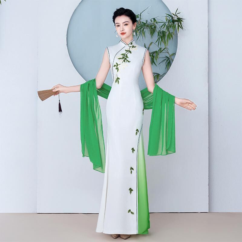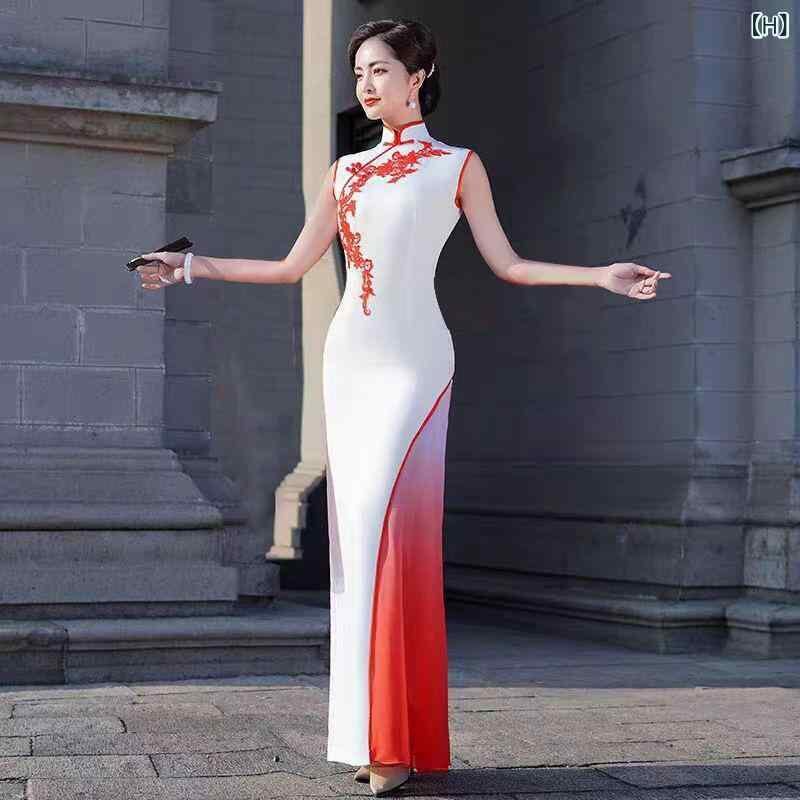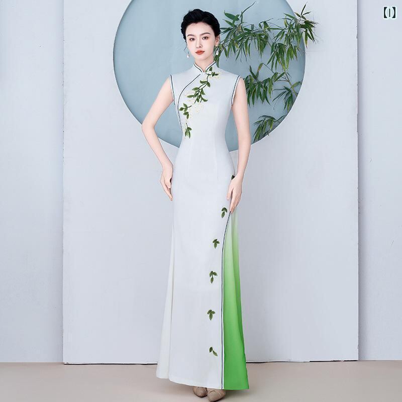 チャイナドレス レディース ノースリーブ ロング丈 改良型 ワンピース ポリエステル エレガント 上品 若々しい ステージ衣装 発表会ドレス パーティー 夏物 大きいサイズ