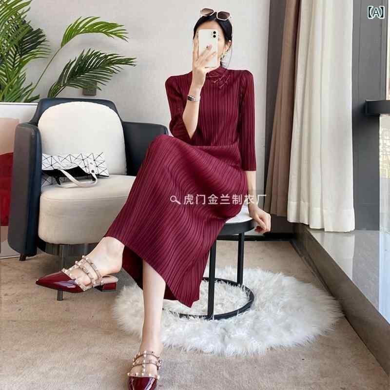 ワンピース 大きいサイズ レディース 春秋 チャイナ風 旗袍 飾りボタン 三宅風 プリーツ デザイン ドレス ミディ丈 ミモレ丈 ポリエステル スタンドカラー 七分袖 レトロ ワインレッド ダークグリーン ブラック フリーサイズ お呼ばれ
