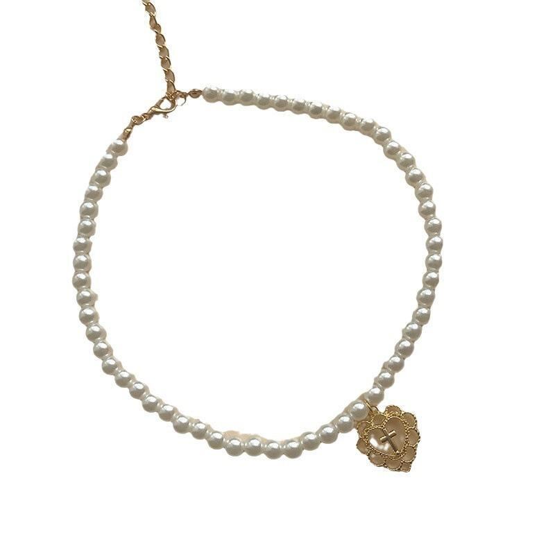 ネックレス レディース レトロ アンティーク調 宮廷風 透かし彫り ハート クロス パール ペンダント チョーカー 鎖骨ネックレス 合金製 ゴールド 韓国風 フェミニン スイート