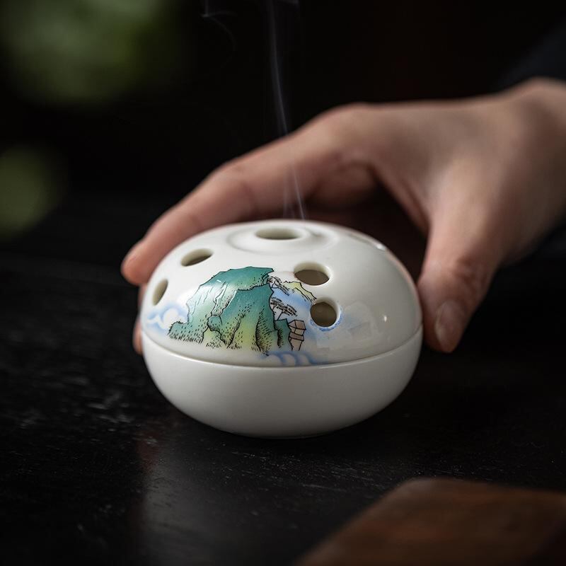 香炉 小型 陶器製 山水画風 禅風 茶道 香道 お香立て 室内用 自宅用 白檀 沈香 芳香 アロマ 癒し リラックス 置物 飾り物 インテリア