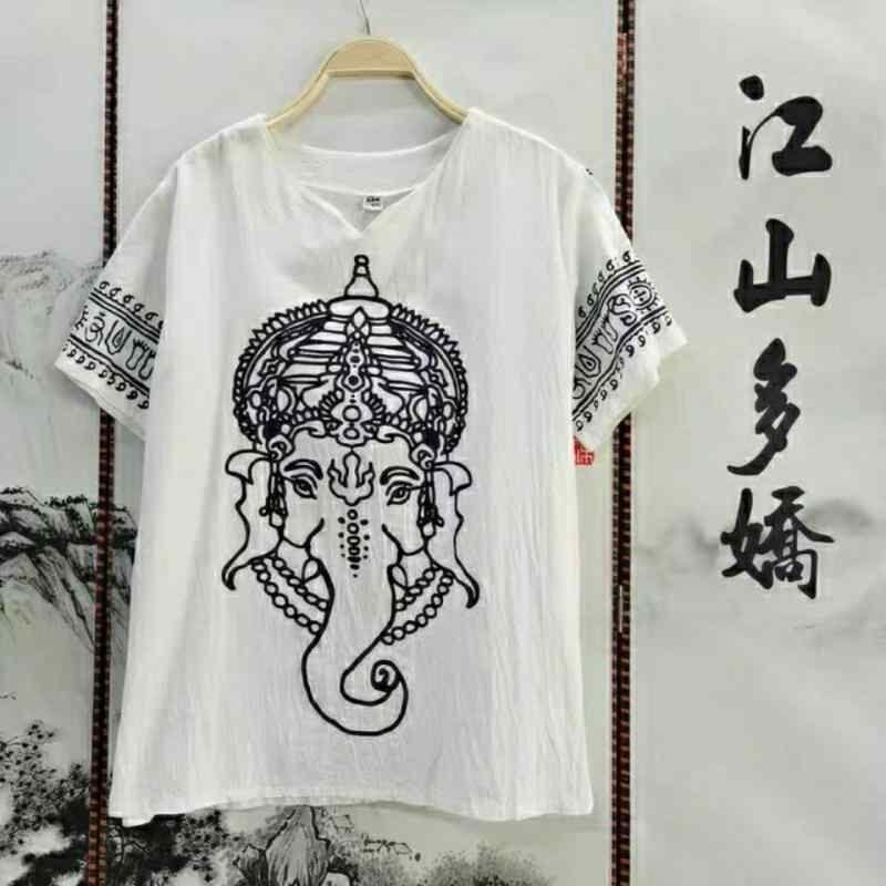 Tシャツ メンズ 綿麻 半袖 Vネック プルオーバー ゆったり 大きいサイズ タイ 象柄 エスニック風 レトロ カジュアル 薄手 通気性 トップス