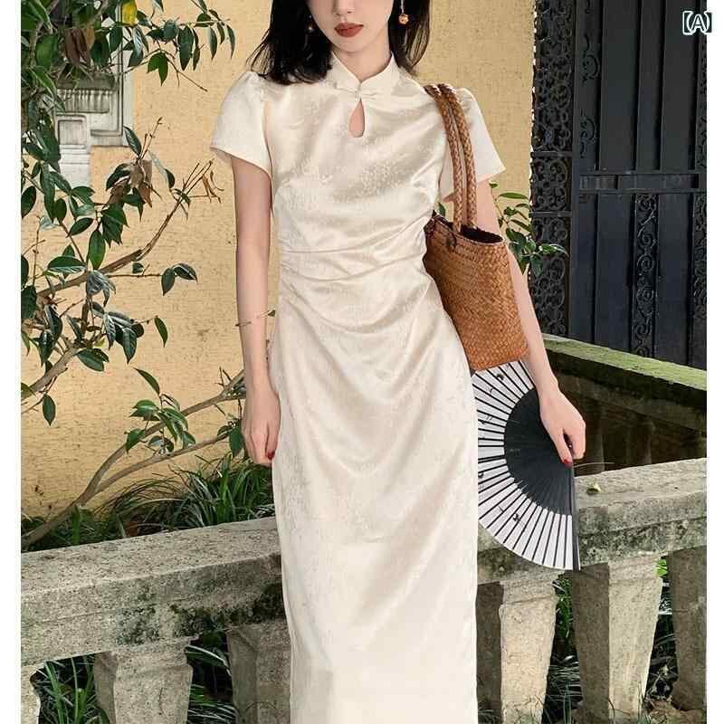 ワンピース レディース 新チャイナ風 チャイナドレス 高級感 ジャカード織り 小花柄 レトロ エレガント 上品 半袖 スタンドカラー ロング丈 ハイウエスト ポリエステル素材 夏 お出かけ着