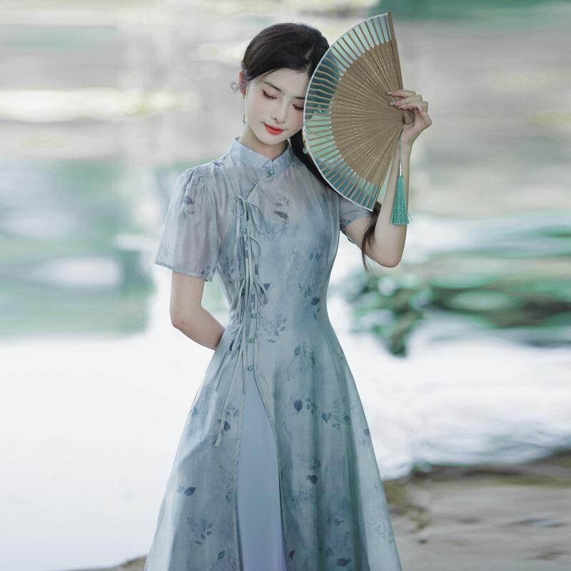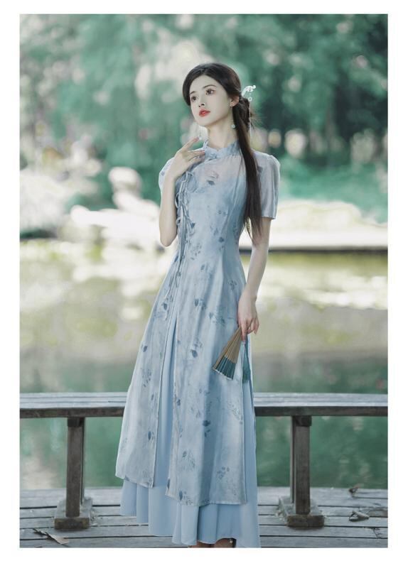 ワンピース レディース 新チャイナ風 フレンチレトロ ハイウエスト Aライン 花柄 プリント 半袖 スタンドカラー 水色 上品 エレガント ポリエステル素材 ミモレ丈 2点セット お出かけ ロマンチック