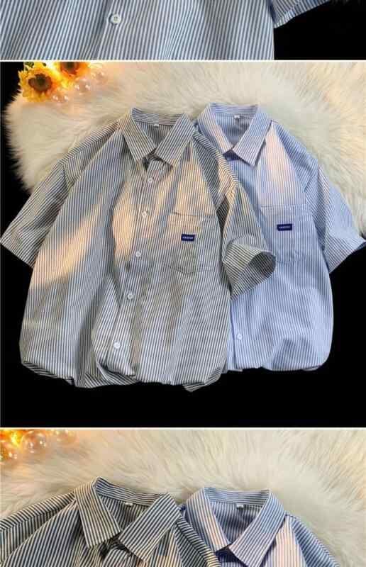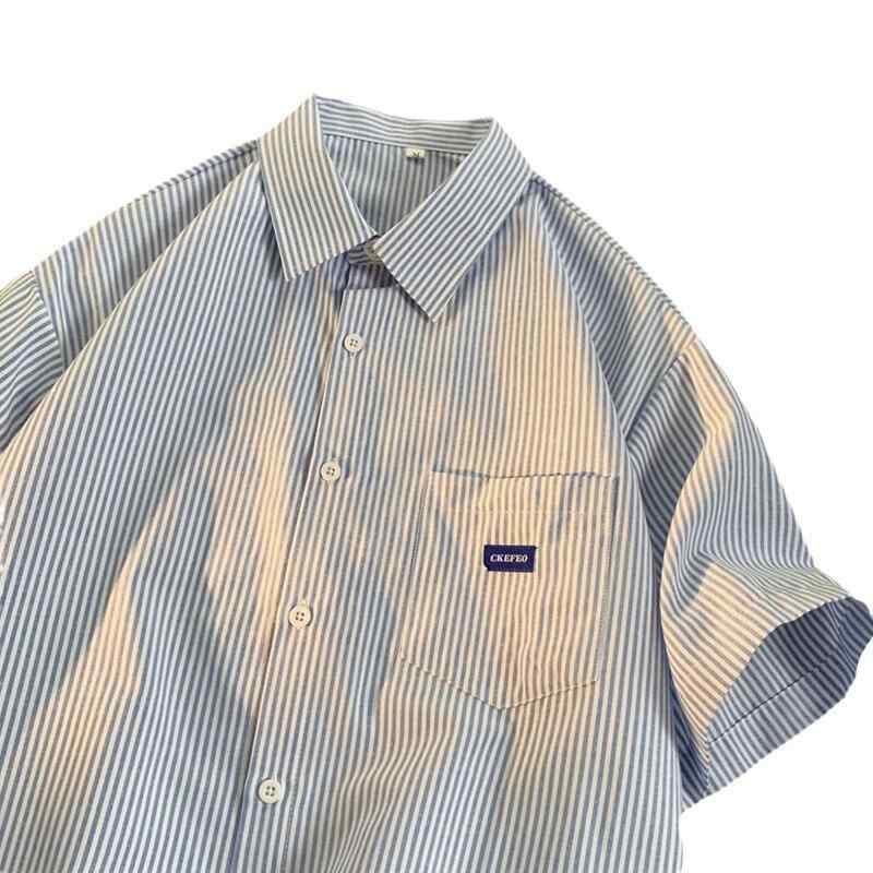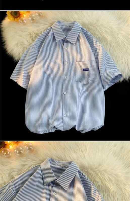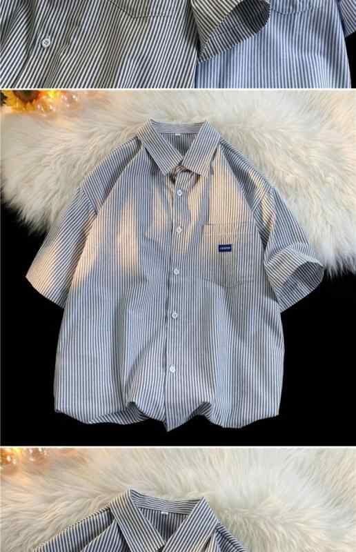 シャツ メンズ 半袖 ストライプ柄 オーバーサイズ ビッグシルエット ゆったり カジュアル アメカジ レトロ 襟付き ポリエステル イージーケア 普段使い デイリーユース ブラック ブルー カップル ペア ユニセックス