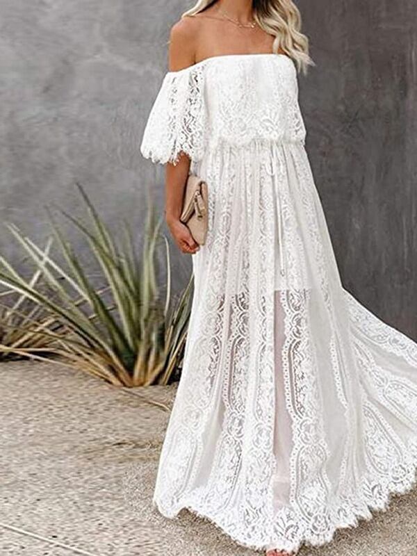 ワンピース レディース オフショルダー レース ロングドレス エレガント ボヘミアン フォーマル パーティー 花柄 Aライン ノースリーブ ポリエステル素材 スイート フェミニン ホワイト ブラック