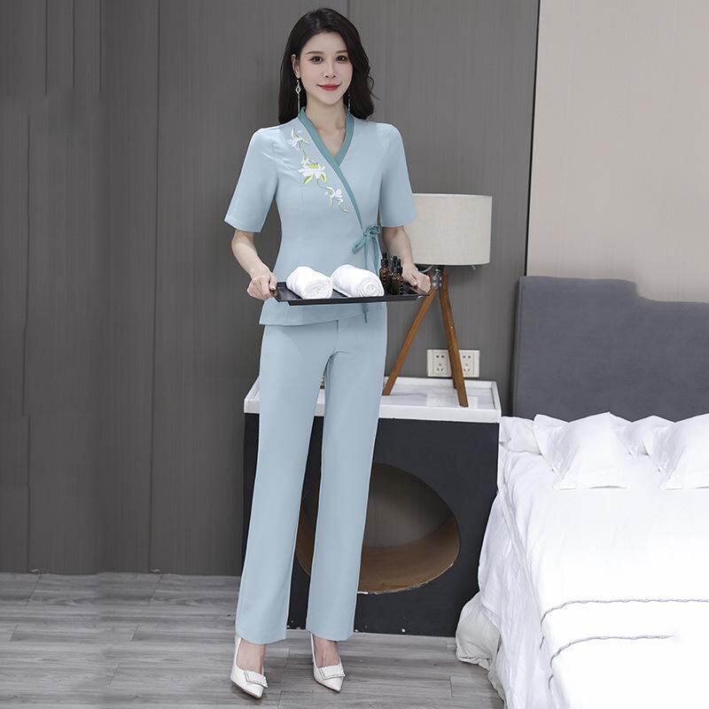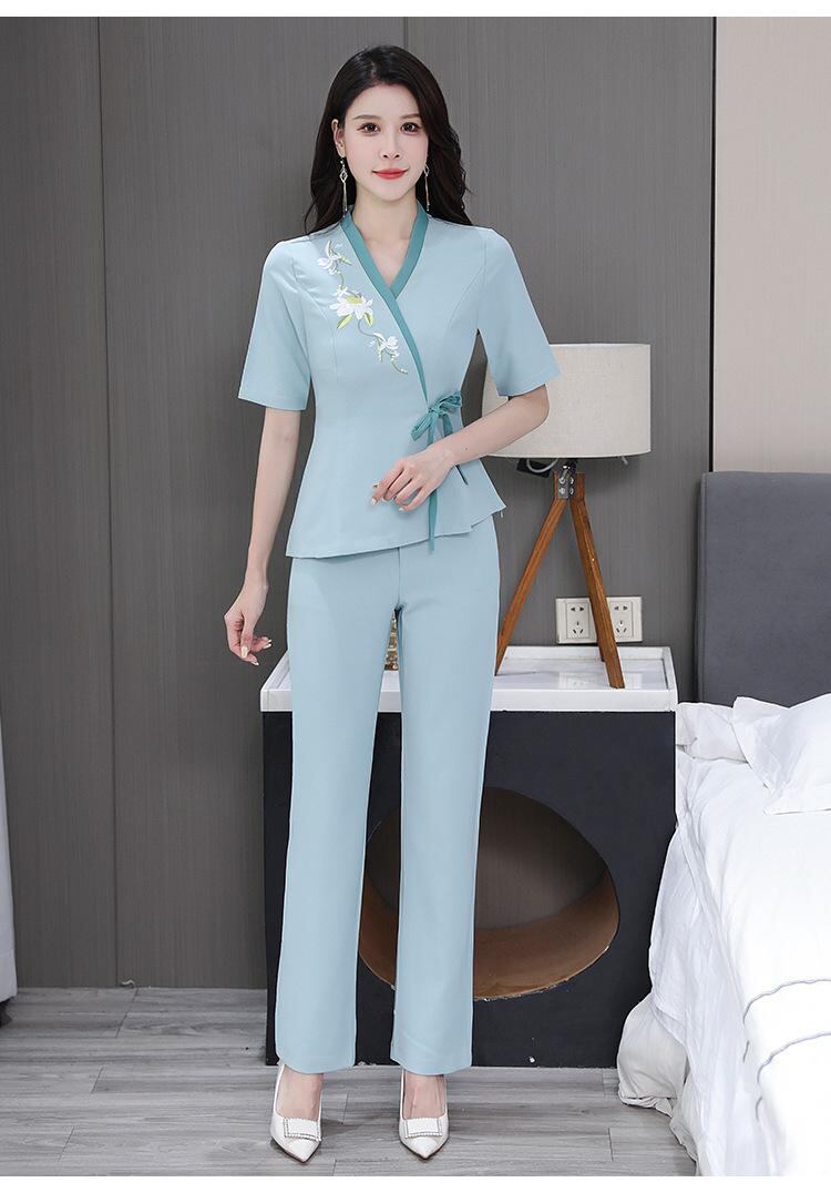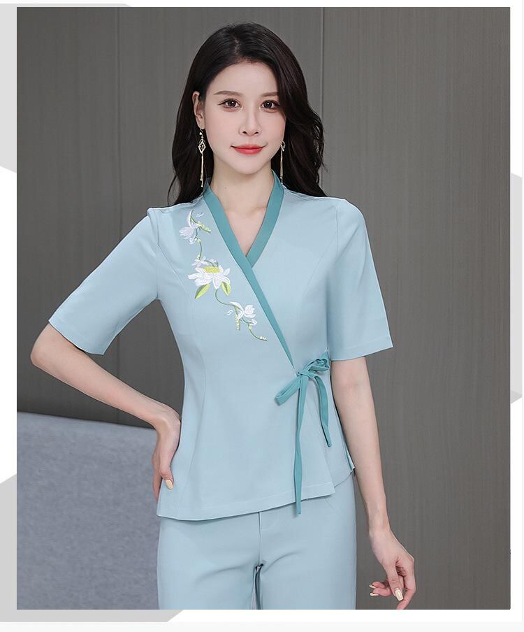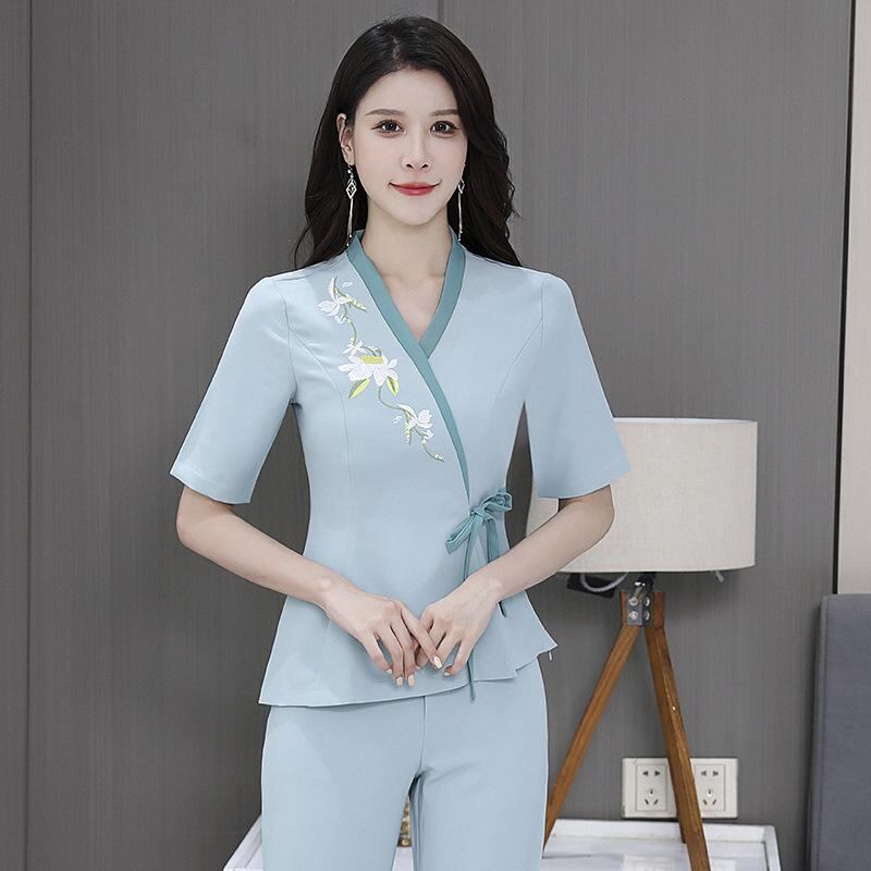 セットアップ レディース 業務用 美容 エステティシャン スパ サロン 施術着 制服 刺繡 五分袖 ロングパンツ ポリエステル スパンデックス ストレッチ エメラルドグリーン