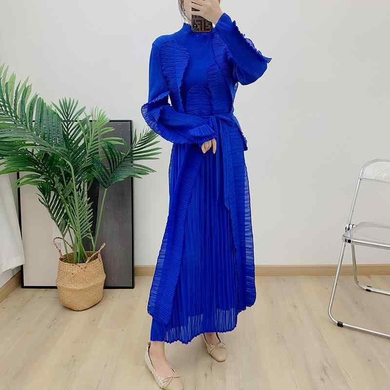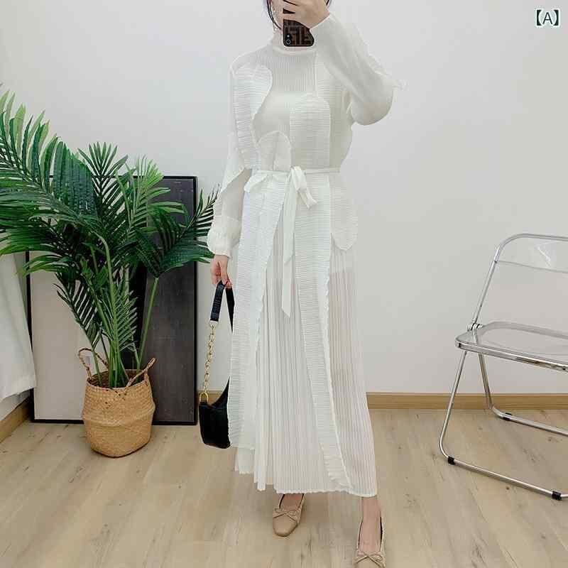 ワンピース レディース レース襟 フリル プリーツ ノースリーブ ロング丈 体型カバー 着痩せ ウエストリボン 大きいサイズ ポリエステル素材 ゆったりシルエット 通勤スタイル